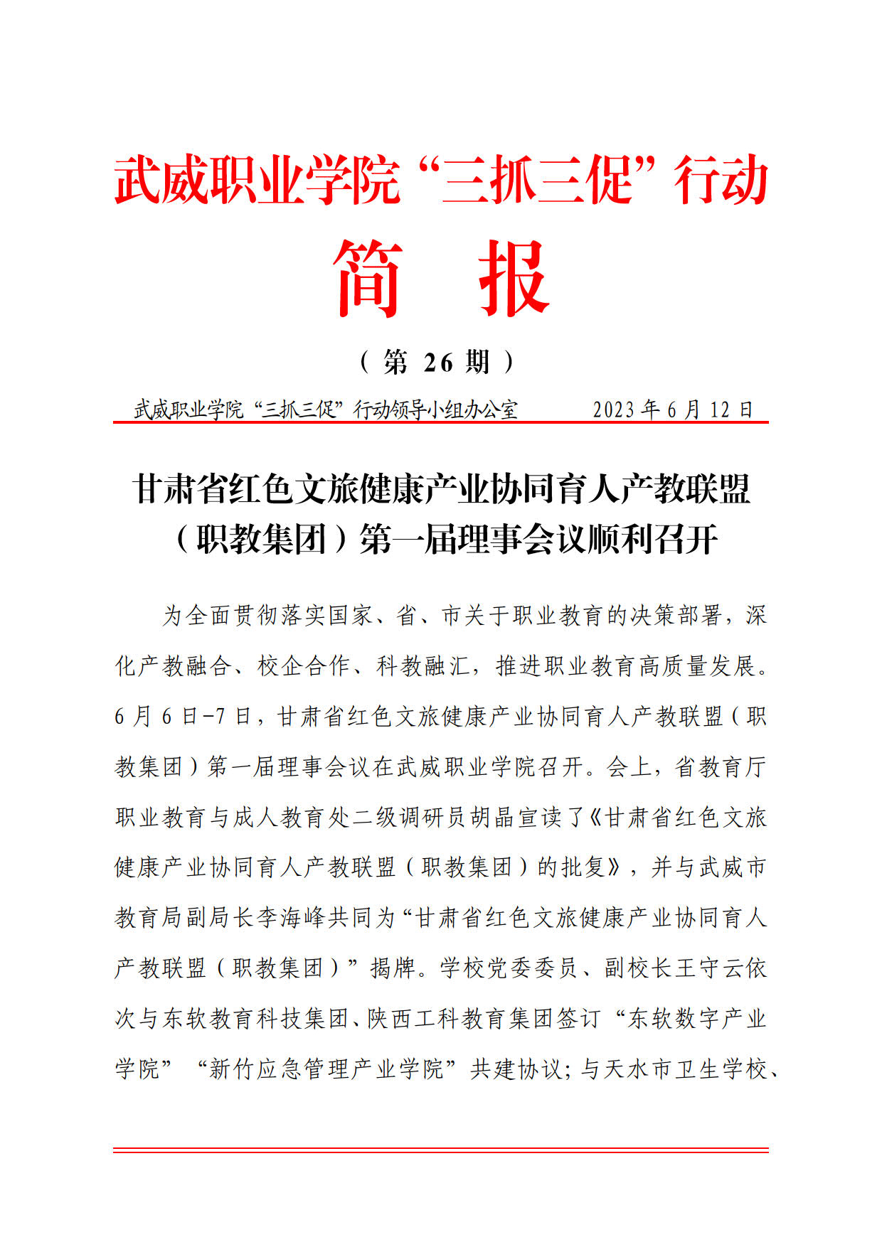 簡報第26期:甘肅省紅色文旅健康產(chǎn)業(yè)協(xié)同育人產(chǎn)教聯(lián)盟(職教集團)第一屆理事會議順利召開