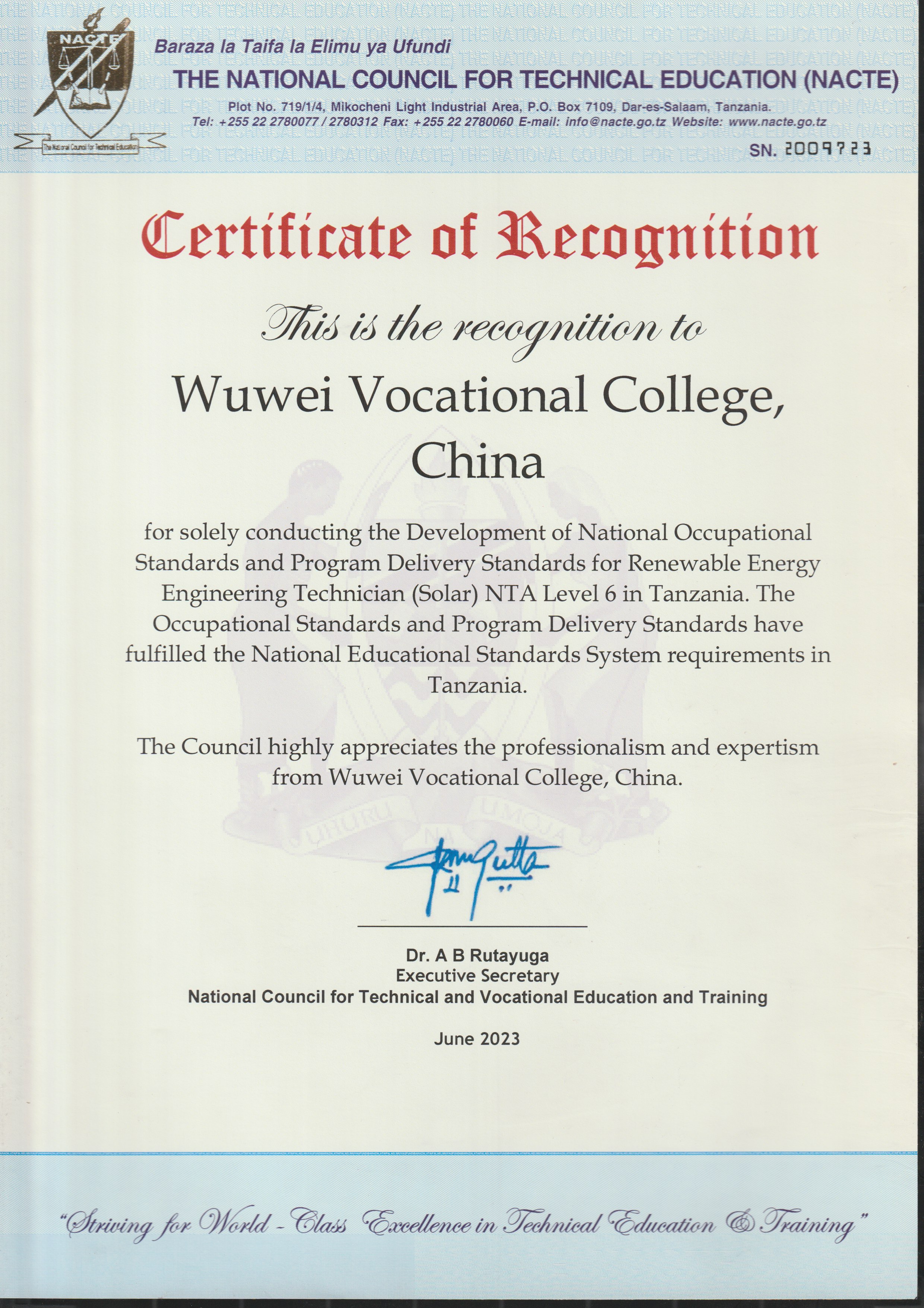 【熱烈祝賀】新能源工程技術(shù)員(太陽能)6級(jí)職業(yè)標(biāo)準(zhǔn)和配套專業(yè)教學(xué)標(biāo)準(zhǔn)通過坦桑尼亞國(guó)家職業(yè)教育委員會(huì)審核獲得認(rèn)證!