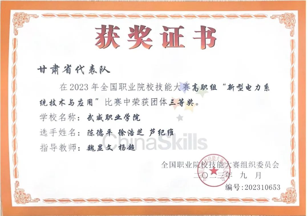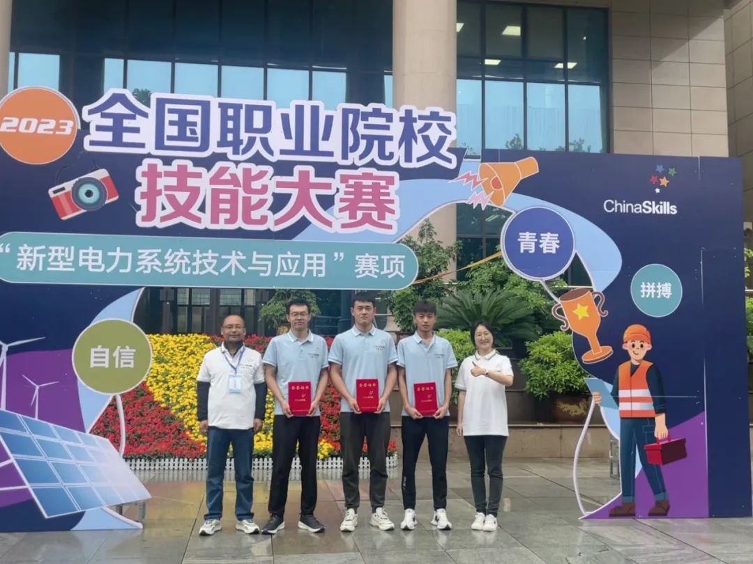 在2023年全國職業(yè)院校技能大賽中中科低碳新能源技術(shù)學(xué)院學(xué)生陳德平、徐浩芝、蘆紀(jì)維獲得高職組新型電力系統(tǒng)技術(shù)與應(yīng)用賽項團(tuán)體三等獎。