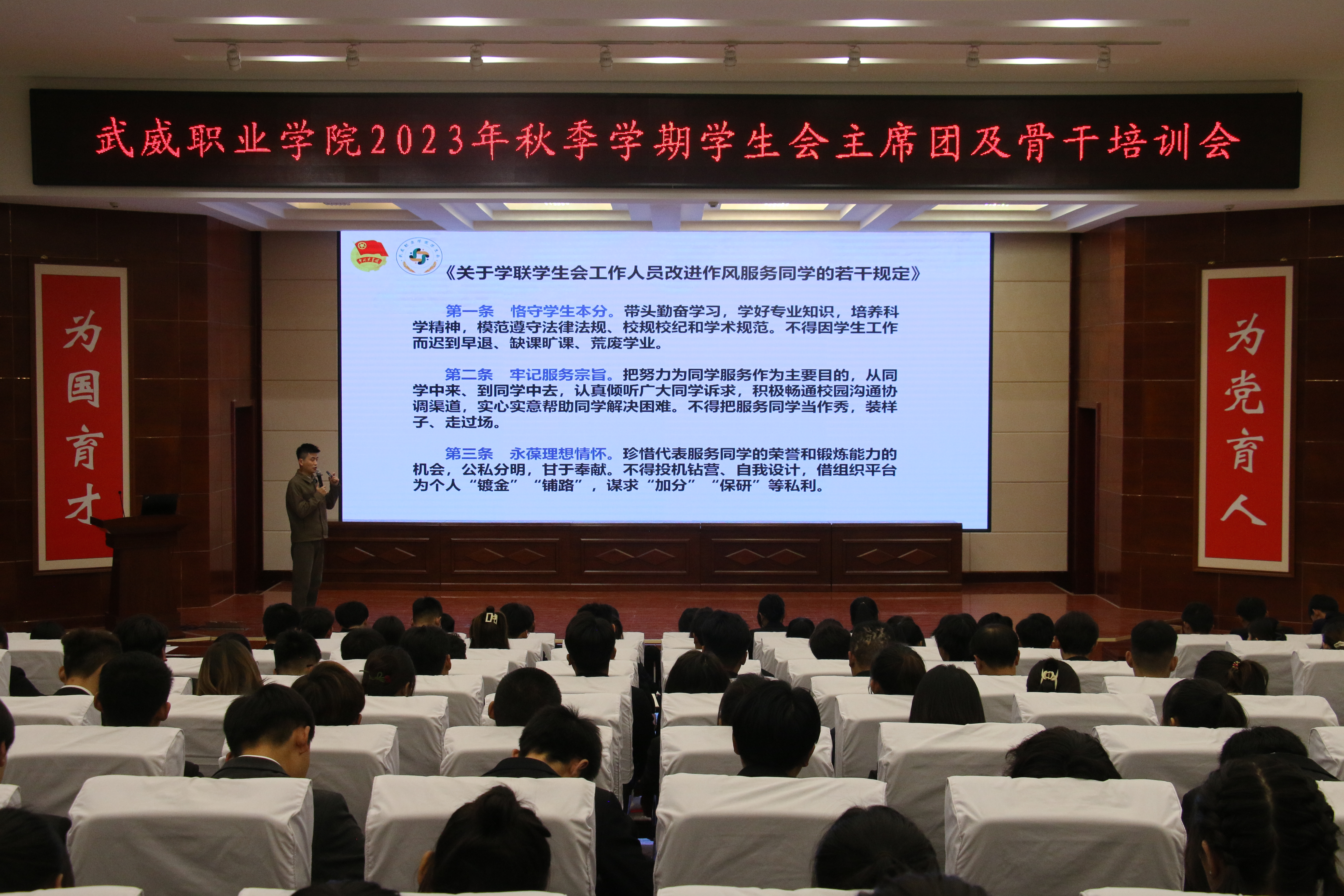 校學生會主席團成員帶頭領學了《關于學聯學生會工作人員改進作風服務同學的若干規(guī)定》《武威職業(yè)學院學生會章程》等制度文件。學生會秘書長張登海以《微光凝聚星海,筑夢情懷方舟》為題,圍繞加強思想政治建設、深化學生會組織改革和進一步加強從嚴治會等方面,為學生會組織成員展開培訓。