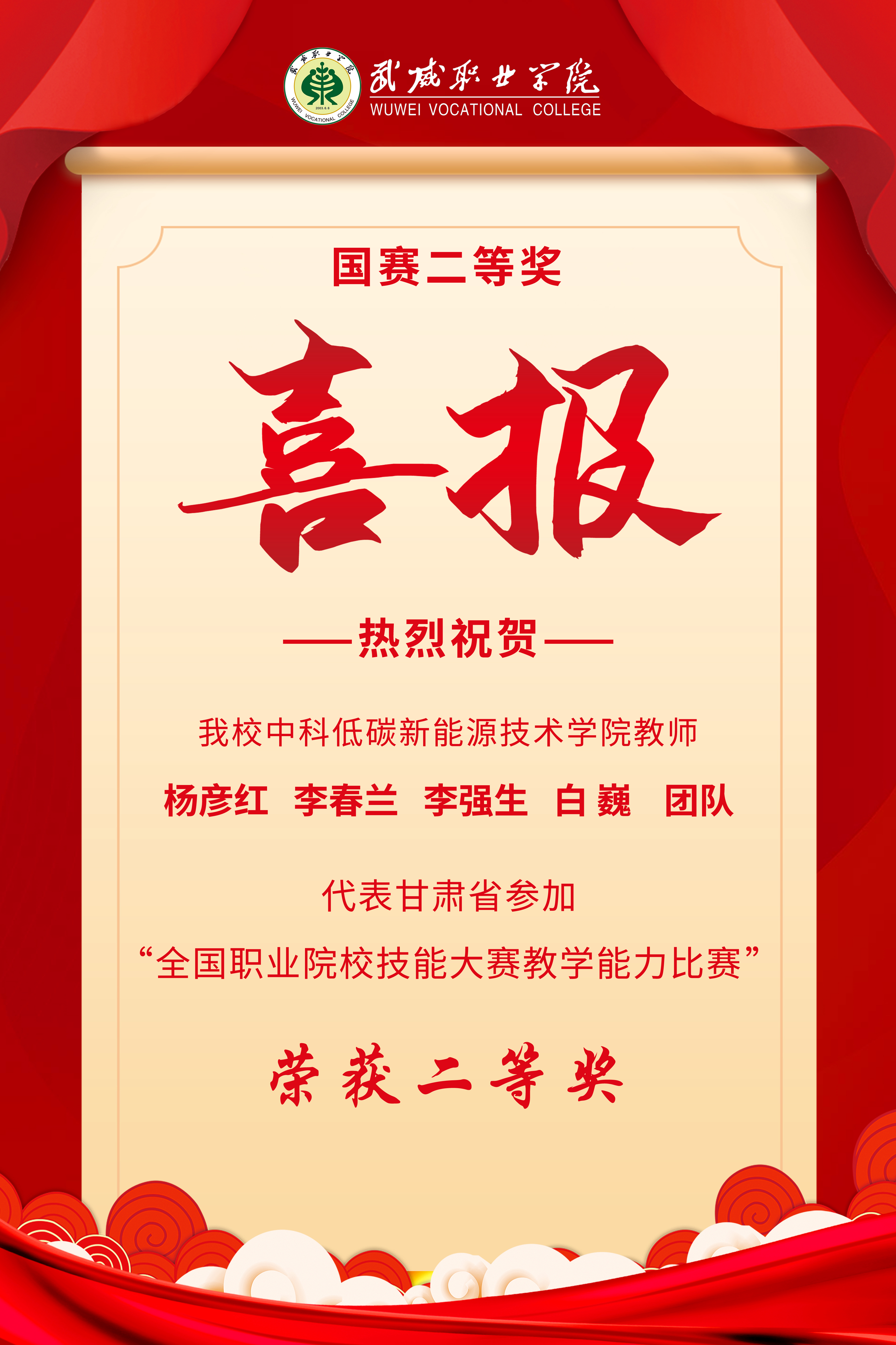 11月23-25日,2023年全國(guó)職業(yè)院校技能大賽教學(xué)能力比賽決賽在江西現(xiàn)代職業(yè)技術(shù)學(xué)院舉行,由我校中科低碳新能源學(xué)院教師楊彥紅、李強(qiáng)生、李春蘭、白巍組成的參賽團(tuán)隊(duì)代表甘肅省參加比賽,喜獲二等獎(jiǎng)。