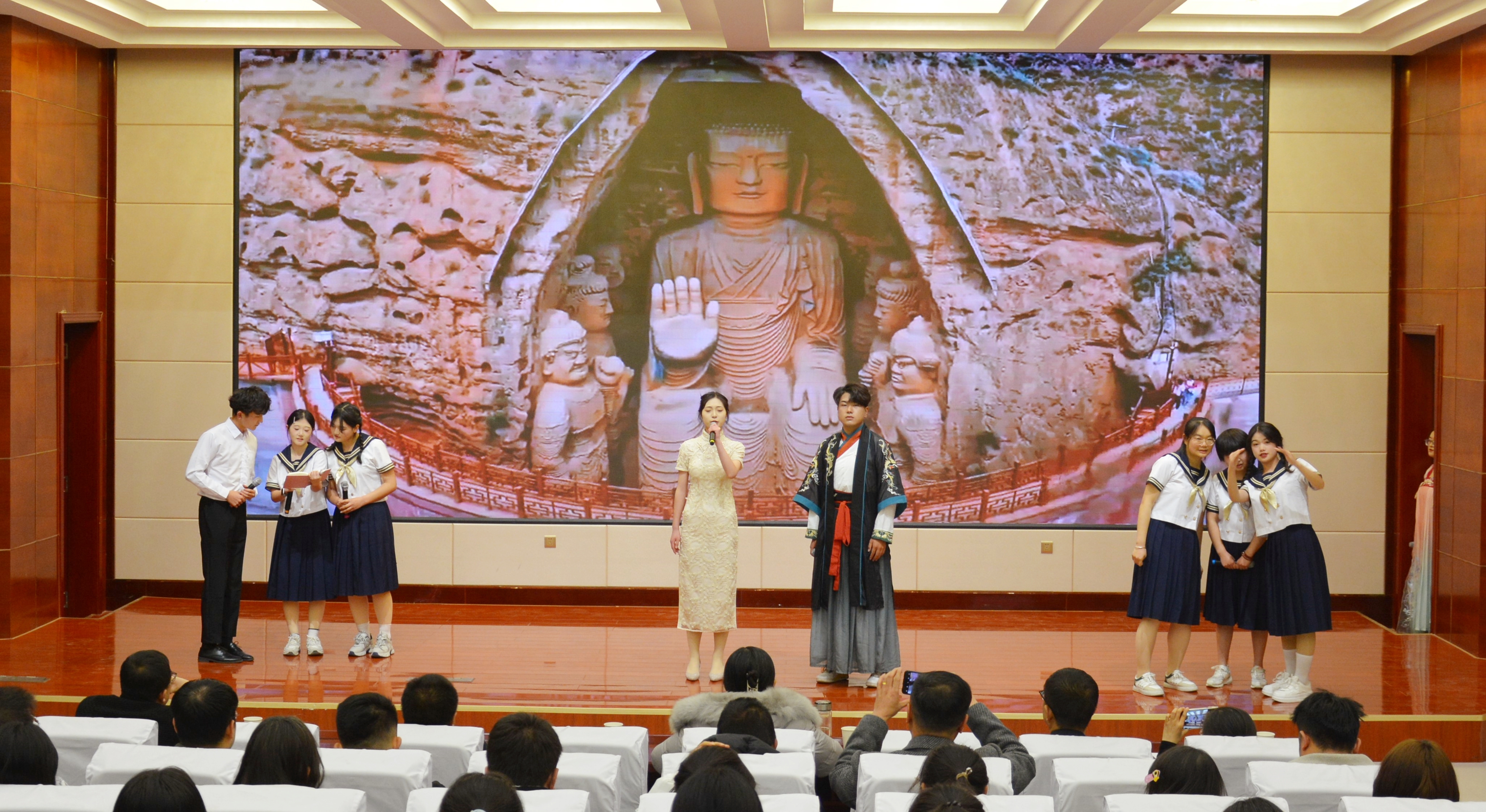 比賽現(xiàn)場精彩紛呈,現(xiàn)場氣氛異常熱烈,掌聲此起彼伏。節(jié)目以詩歌吟誦、伴舞、書法、國畫、武術(shù)、情景表演等豐富多彩的藝術(shù)形式,為現(xiàn)場觀眾打造出一場別開生面的涼州文化視聽盛宴。同學(xué)們激情洋溢,用澎湃真摯的情感演繹著經(jīng)典燦爛的磅礴詩篇,用跨越千年的對話勾勒出雄渾壯烈的漢武雄風(fēng),用鏗鏘有力的旋律編織出蕩氣回腸的時代頌歌,以青春奮斗的初心賡續(xù)著生生不息的五涼文化。