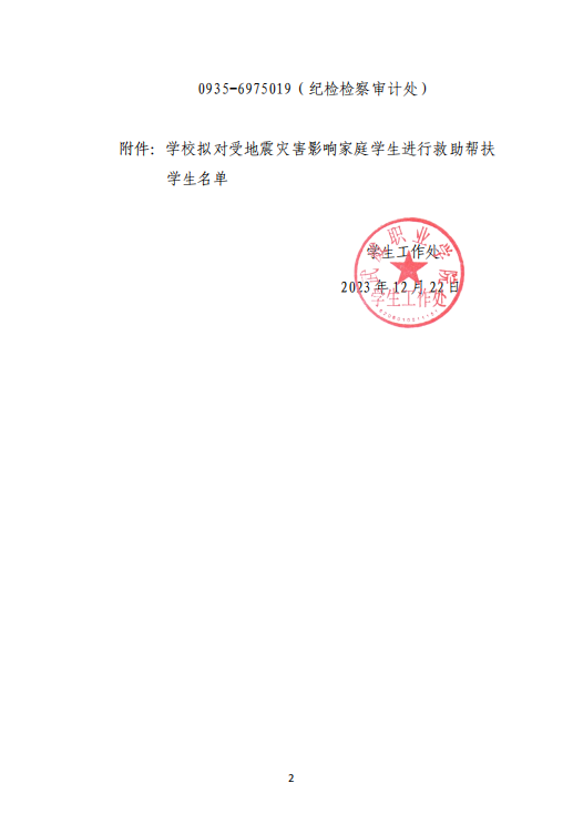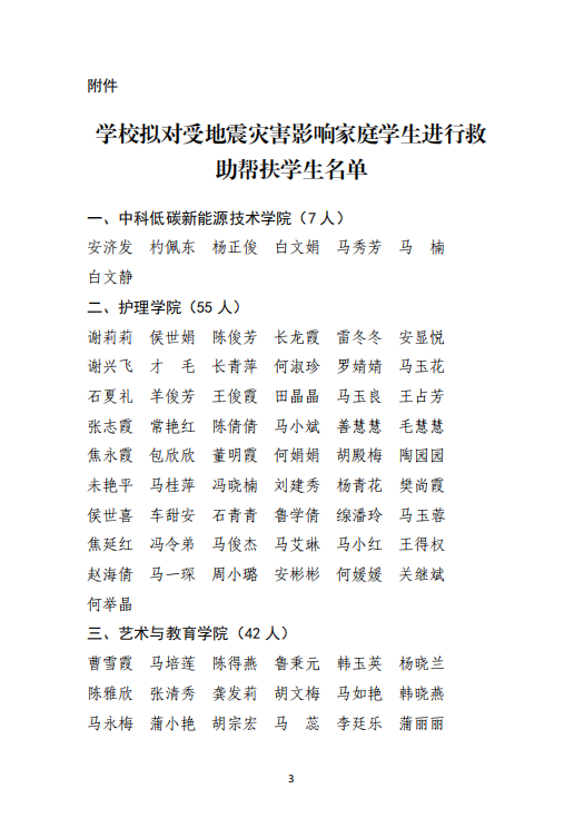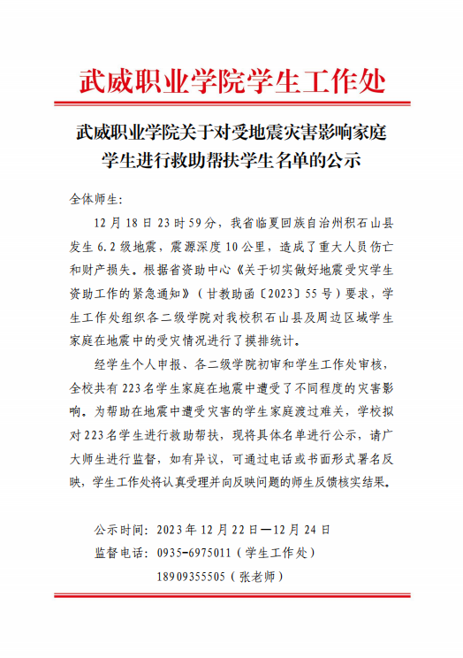 武威職業(yè)學(xué)院關(guān)于對受地震災(zāi)害影響家庭學(xué)生進行救助幫扶學(xué)生名單的公示