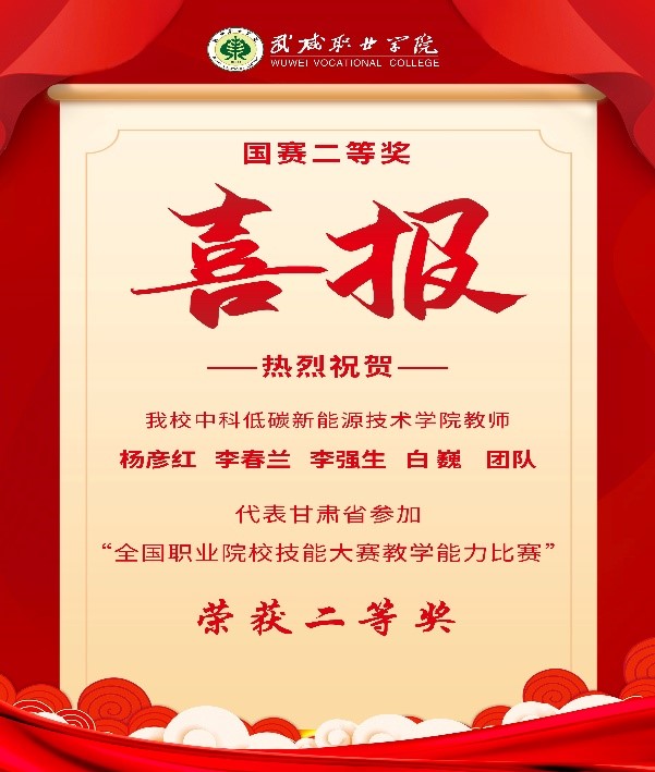 近日,2023年全國職業(yè)院校技能大賽教學(xué)能力比賽決賽在江西現(xiàn)代職業(yè)技術(shù)學(xué)院落下帷幕,由中科低碳新能源學(xué)院教師楊彥紅、李春蘭、李強(qiáng)生、白巍組成的參賽團(tuán)隊(duì)作為甘肅省唯一一支打入國賽決賽的團(tuán)隊(duì),代表甘肅省參加比賽,喜獲專業(yè)課程高職一組二等獎。
