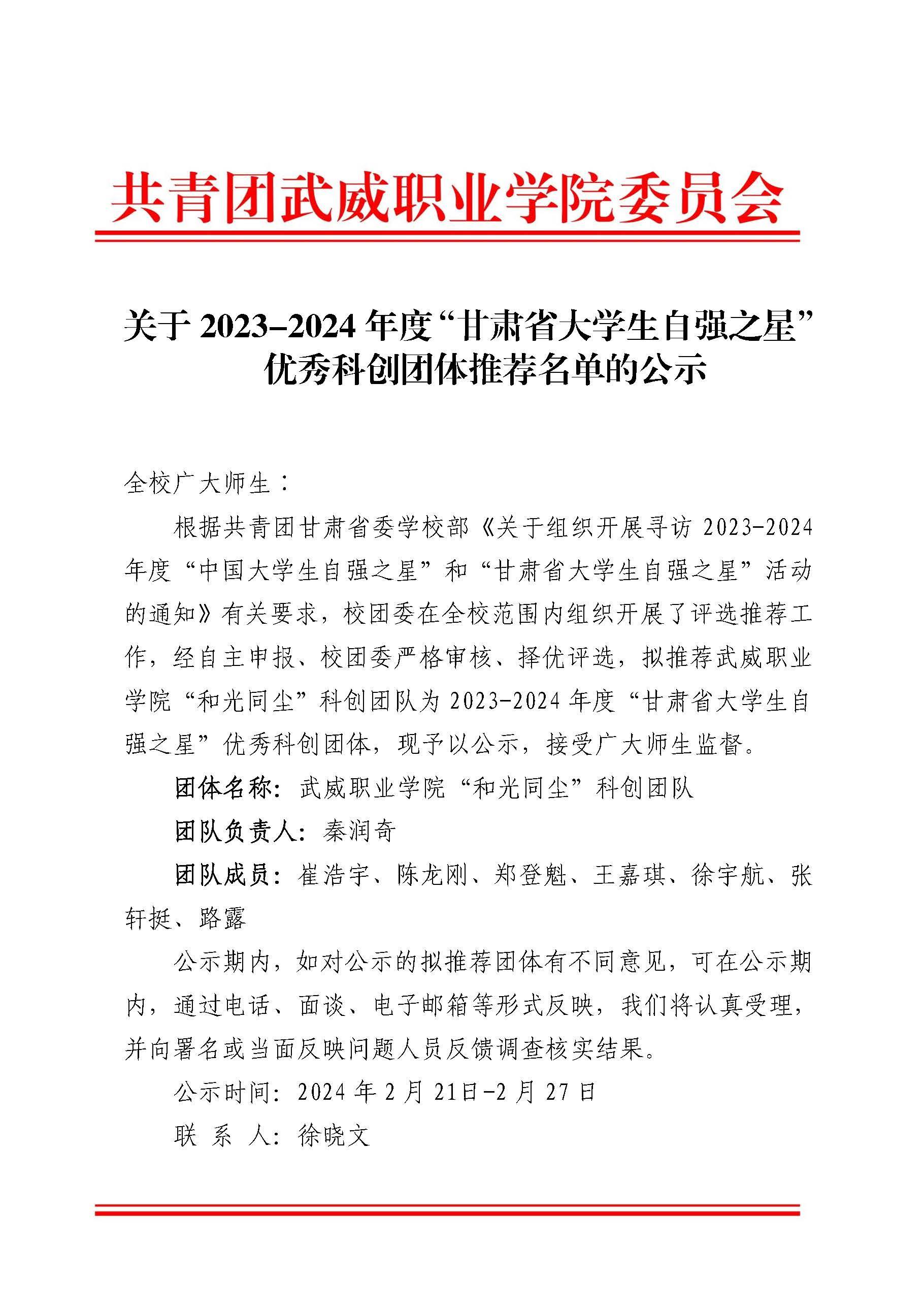 關(guān)于2023-2024年度“甘肅省大學(xué)生自強之星”優(yōu)秀科創(chuàng)團體推薦名單的公示