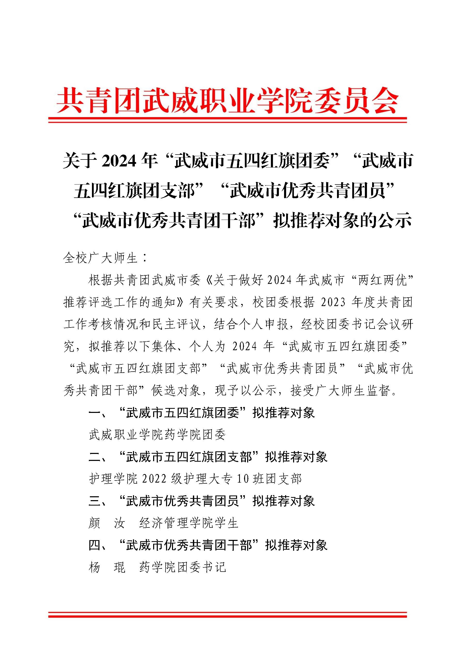 關(guān)于2024年“武威市五四紅旗團委”“武威市五四紅旗團支部”“武威市優(yōu)秀共青團員”“武威市優(yōu)秀共青團干部”擬推薦對象的公示
