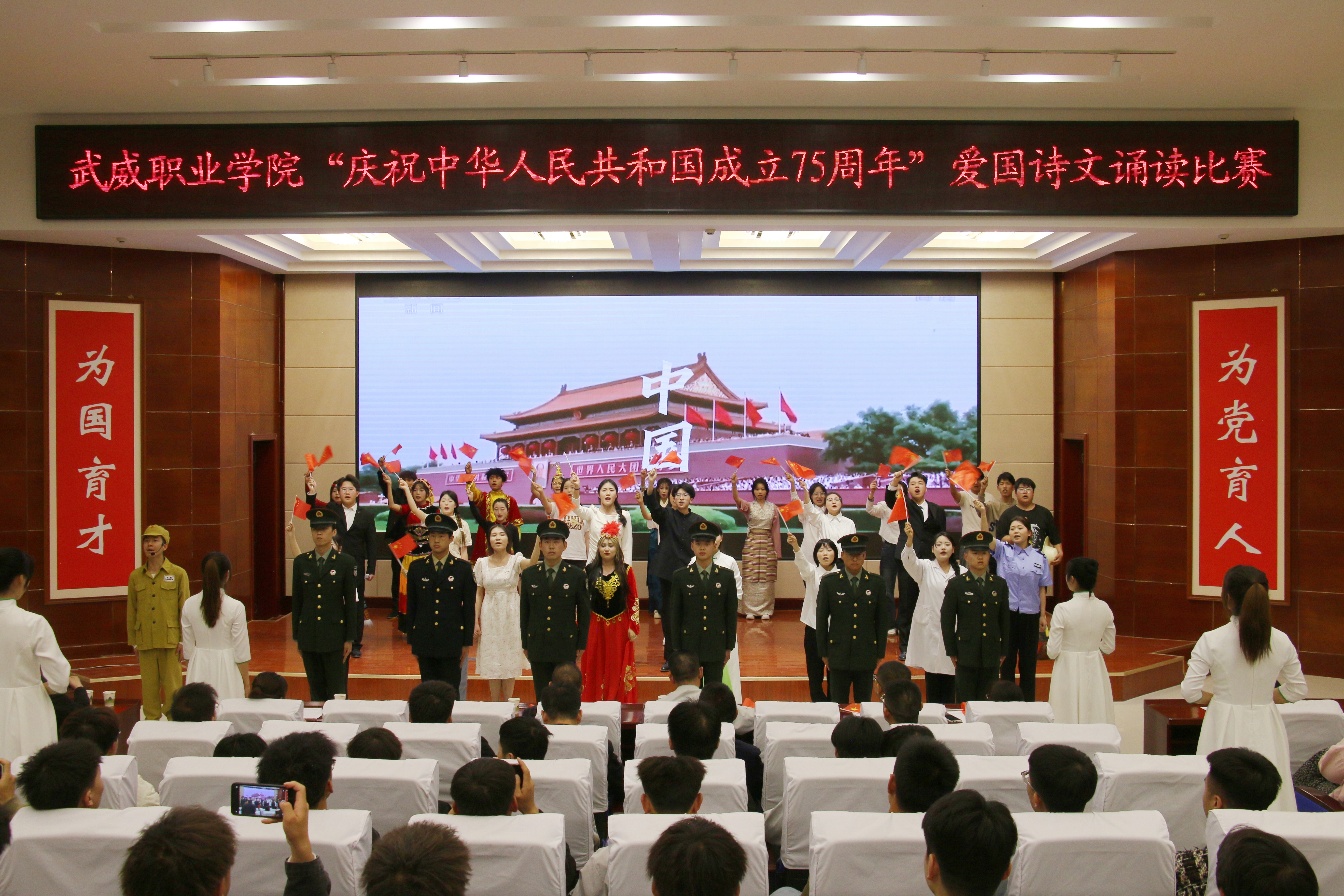 4月25日晚,學校“紀念‘五四’運動105周年暨慶祝新中國成立75周年”愛國詩文誦讀比賽在菁英廳舉辦。黨委委員、副校長王守云出席活動,各二級學院團委書記及學生代表220余人觀看比賽。