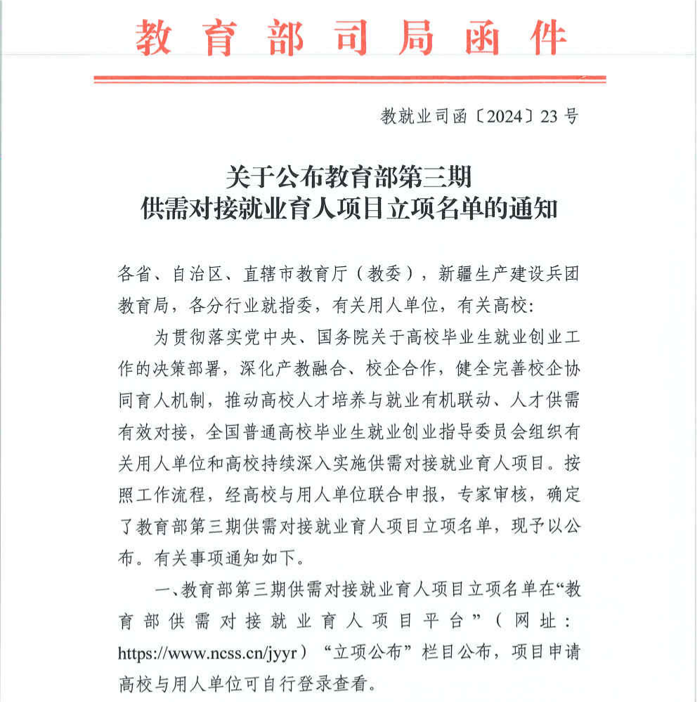 供需對接就業(yè)育人項目是教育部貫徹落實黨中央、國務(wù)院“穩(wěn)就業(yè)”“保就業(yè)”決策部署的舉措之一,旨在深化產(chǎn)教融合、校企合作,推動人才培養(yǎng)與就業(yè)有機聯(lián)動、人才供需有效對接的有效途徑。供需對接就業(yè)育人項目由高校和用人單位共同申報,經(jīng)教育部組織專家審核立項。用人單位提供項目專項經(jīng)費和資源支持,通過與高校開展定向人才培養(yǎng)、就業(yè)實習(xí)等合作,培養(yǎng)更多高素質(zhì)技術(shù)技能型人才。