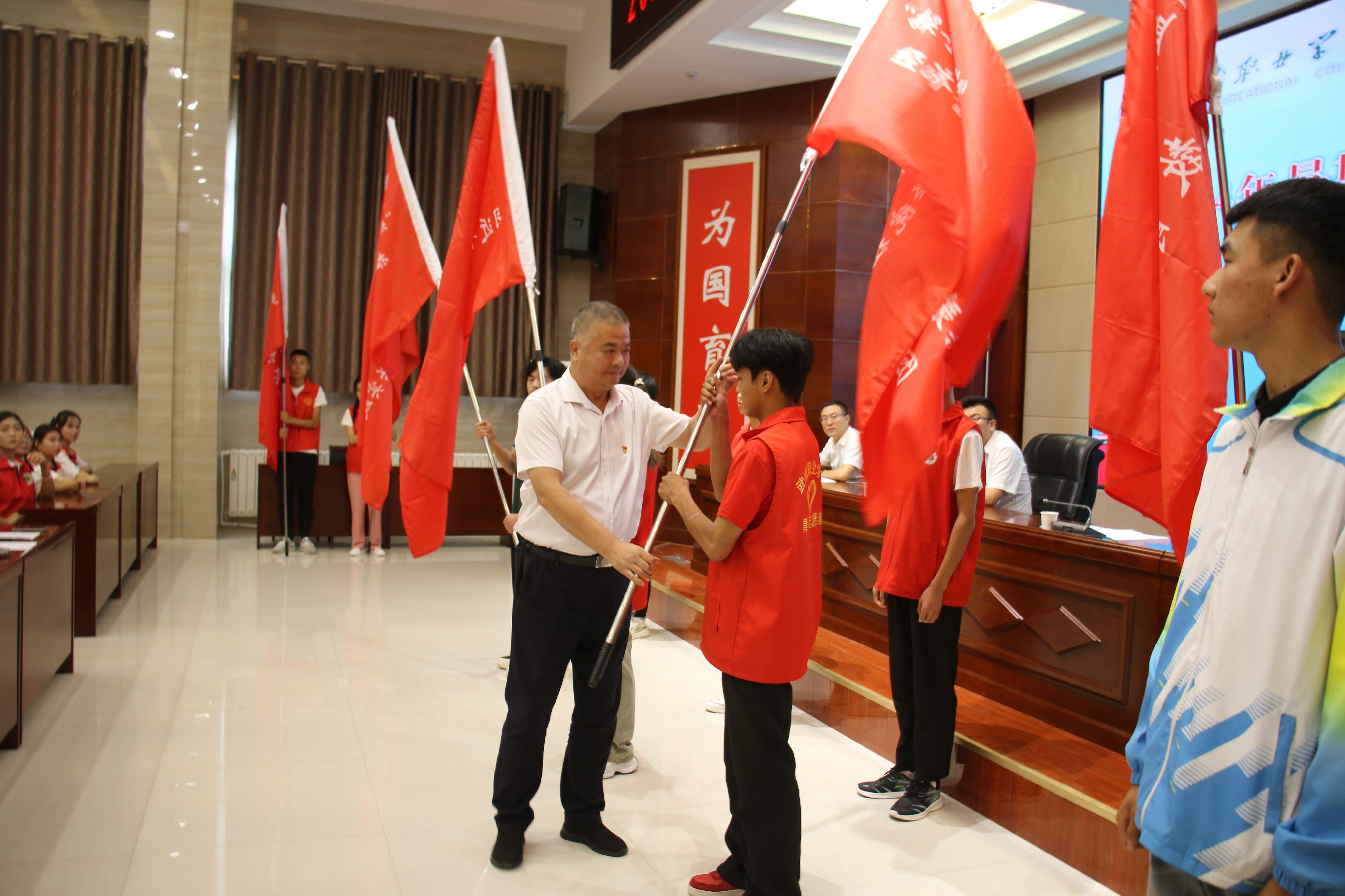 王守云為國家級(jí)和省級(jí)重點(diǎn)立項(xiàng)團(tuán)隊(duì)授旗,并對(duì)即將啟程的實(shí)踐團(tuán)隊(duì)提出三點(diǎn)希望和要求:一是要緊扣活動(dòng)主題,在學(xué)思踐悟中筑牢信仰根基;二是積極探索實(shí)踐,在篤行實(shí)干中練就過硬本領(lǐng);三是主動(dòng)擔(dān)當(dāng)作為,在踔厲奮發(fā)中展示武職風(fēng)采。希望同學(xué)們向下扎根、向上生長,鍛煉自我的同時(shí),筑牢“安全防線”,高質(zhì)量開展本次社會(huì)實(shí)踐活動(dòng),收獲成長與進(jìn)步,將“三下鄉(xiāng)”活動(dòng)打造為我校形象展示的重要窗口和靚麗名片。