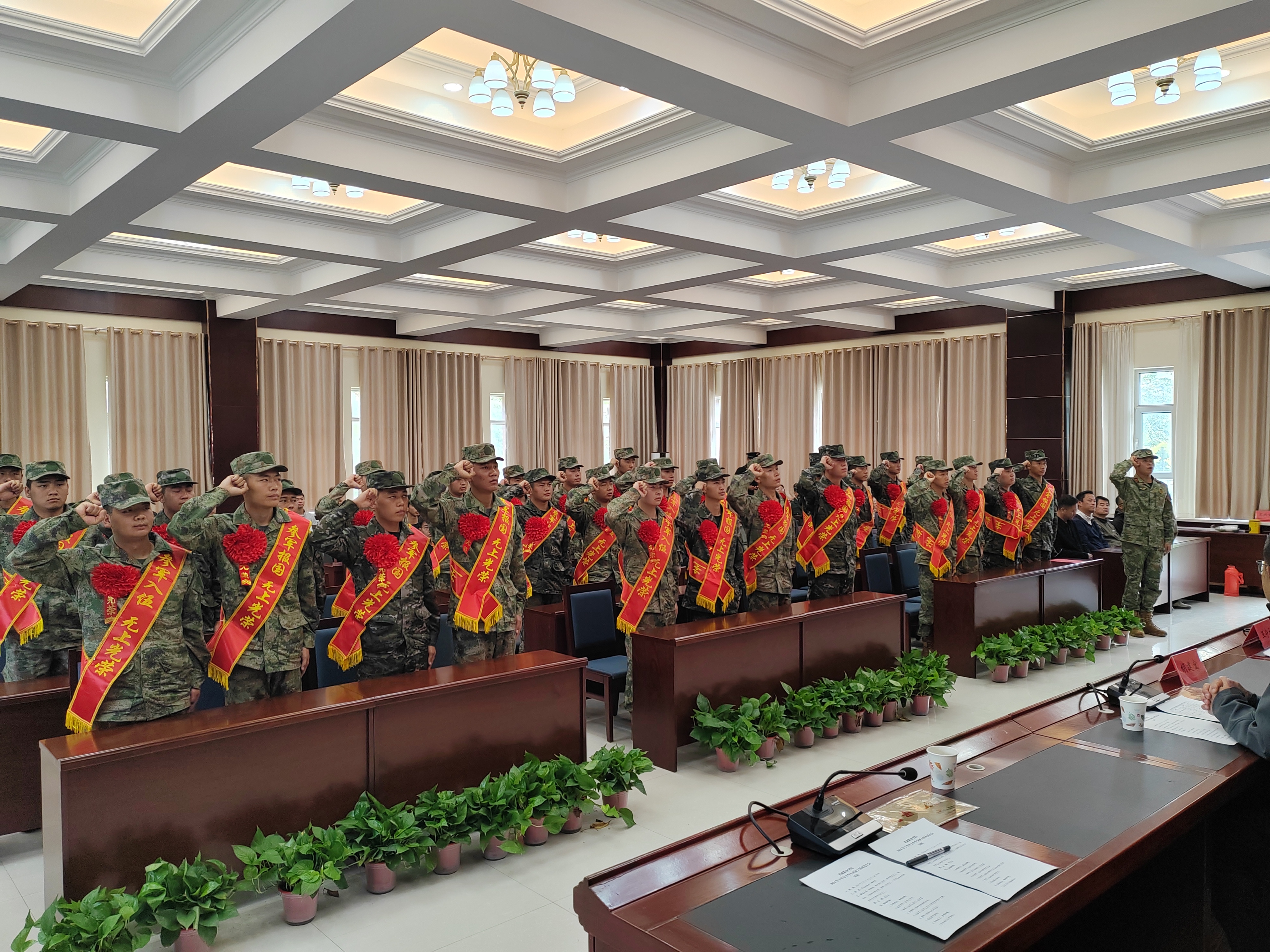 歡送大會上,入伍學(xué)生在退伍復(fù)學(xué)大學(xué)生代表的帶領(lǐng)下進(jìn)行了鏗鏘有力的入伍宣誓,參會領(lǐng)導(dǎo)向?qū)W校所在地入伍的30名新兵佩戴大紅花并贈送紀(jì)念品,為入伍學(xué)生家長代表頒發(fā)“光榮之家”光榮牌。