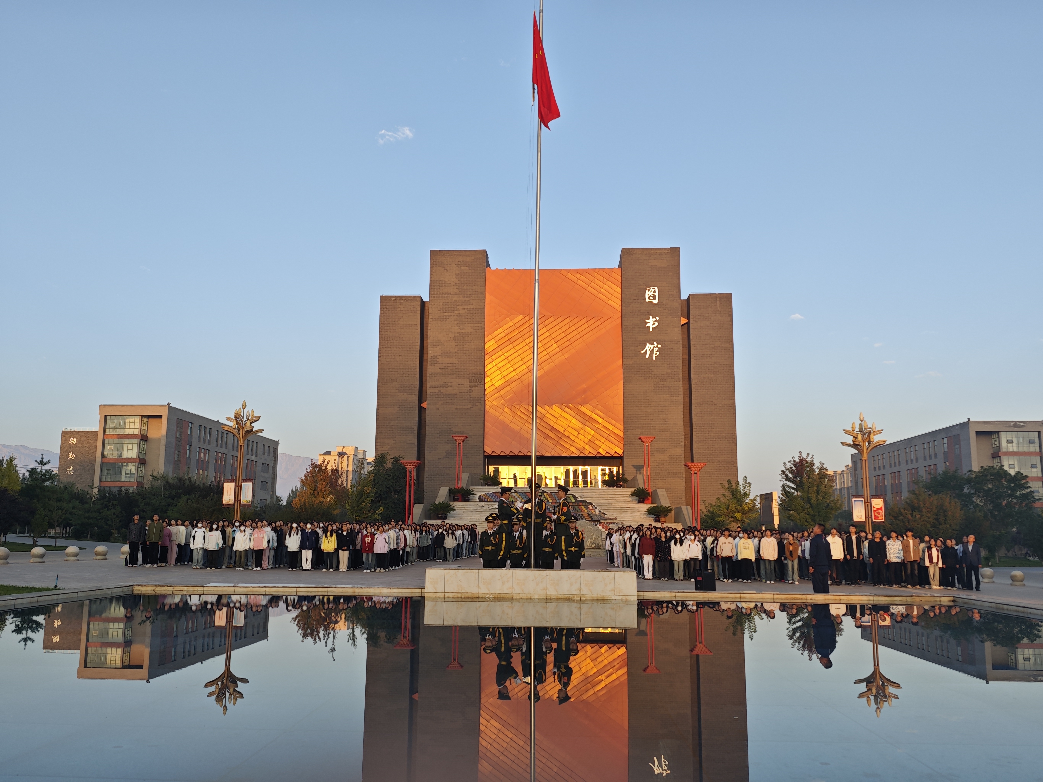 七點(diǎn)十五分,升國旗儀式正式開始。在全體師生的注視下,國旗護(hù)衛(wèi)隊(duì)邁著整齊的步伐護(hù)送五星紅旗進(jìn)場,伴隨著莊嚴(yán)的《義勇軍進(jìn)行曲》,五星紅旗冉冉升起。全體師生肅穆而立,行注目禮,齊唱國歌。
