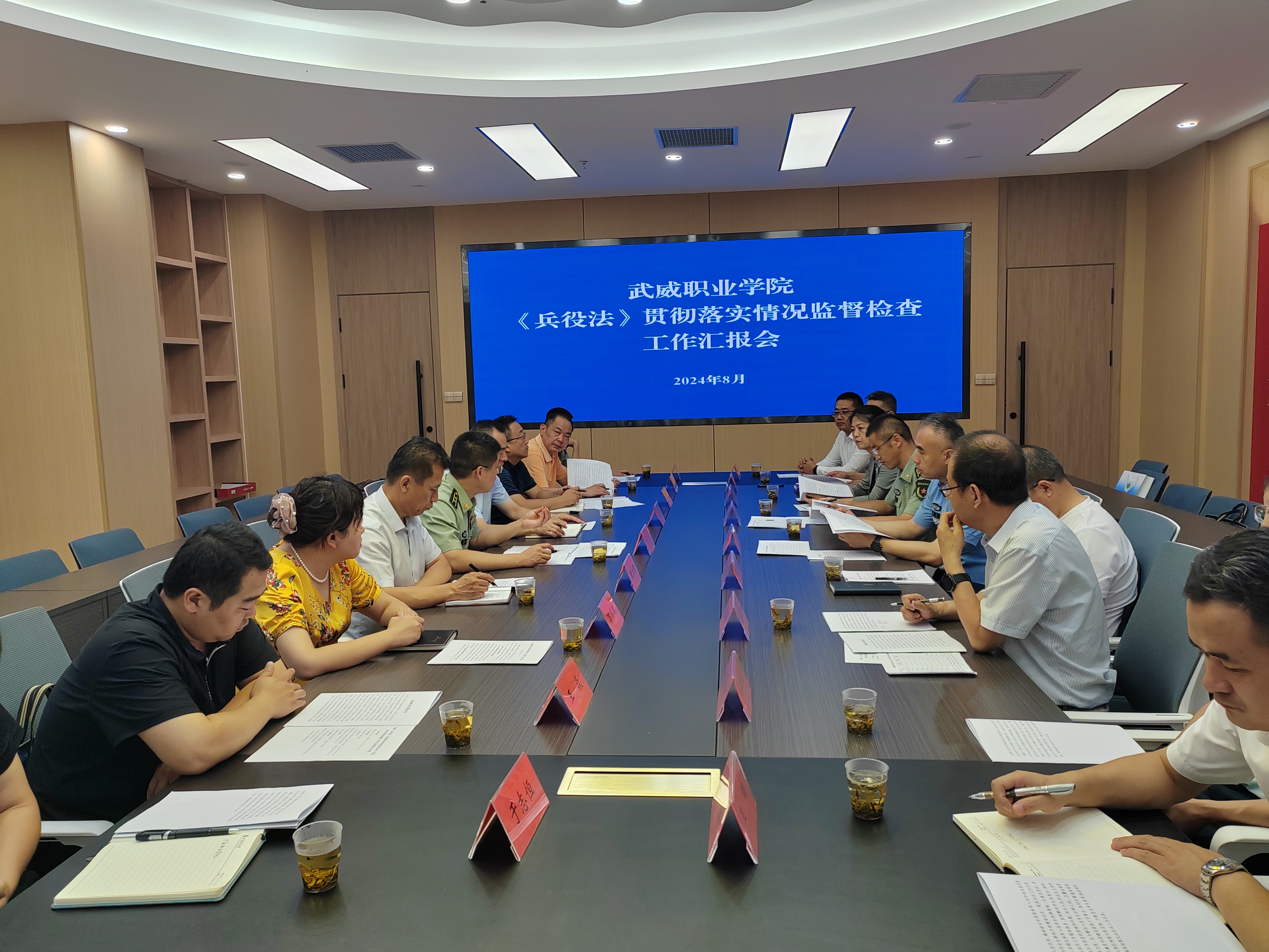 8月2日上午,省級(jí)《兵役法》貫徹落實(shí)情況監(jiān)督檢查工作組一行9人在甘肅省軍區(qū)動(dòng)員局征集處程龍?zhí)庨L(zhǎng)的帶領(lǐng)下,在武威軍分區(qū)大校副司令員吳沖、武威市司法局副局長(zhǎng)黨萬(wàn)馳和武威市教育局副局長(zhǎng)馬曉麗的陪同下,來(lái)我校調(diào)研《兵役法》貫徹落實(shí)情況。學(xué)校黨委書記王宏,黨委副書記翟存祥,黨委委員、副校長(zhǎng)王永緒陪同調(diào)研。