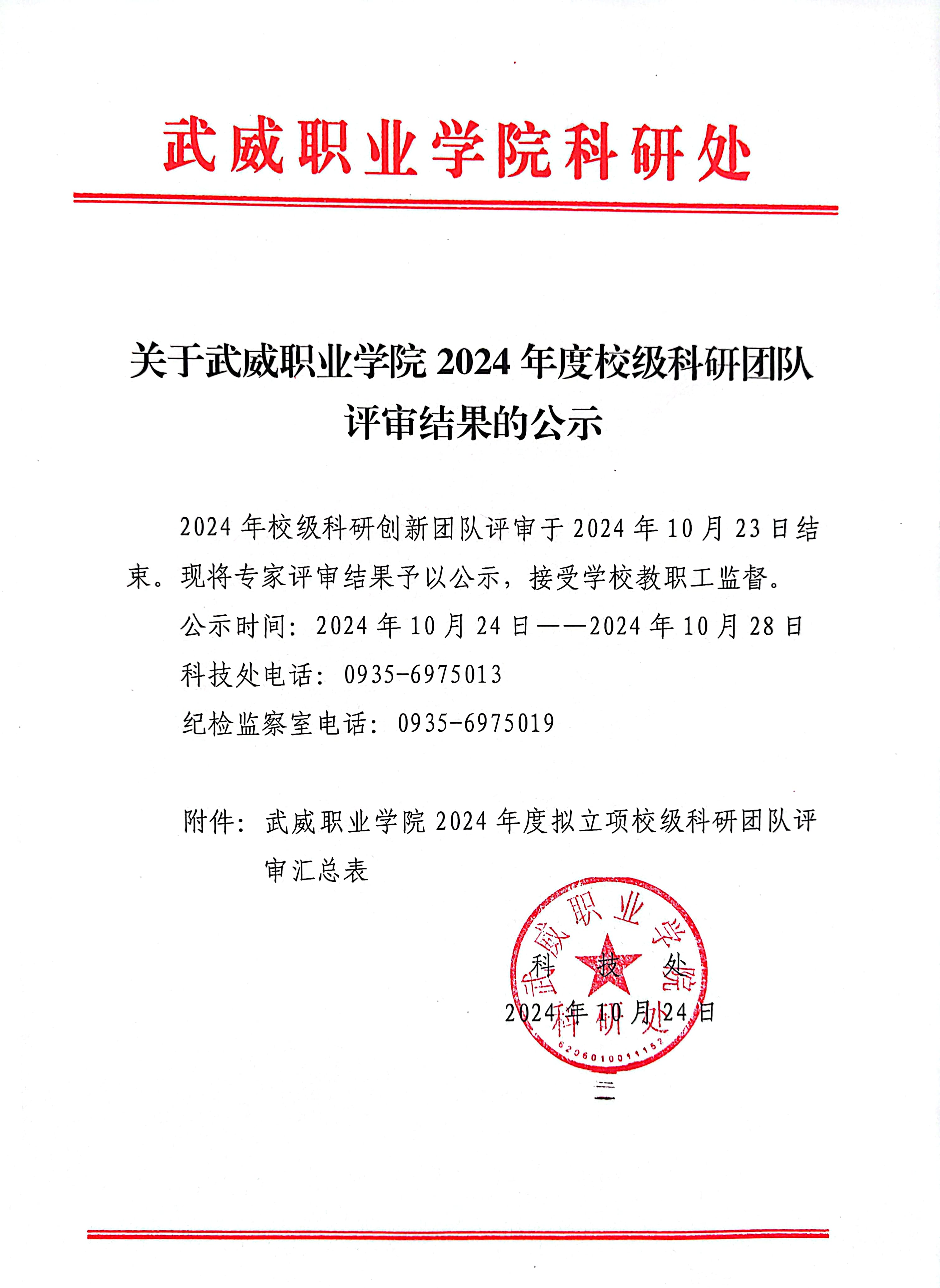 關于武威職業(yè)學院2024年度校級科研團隊評審結果的公示