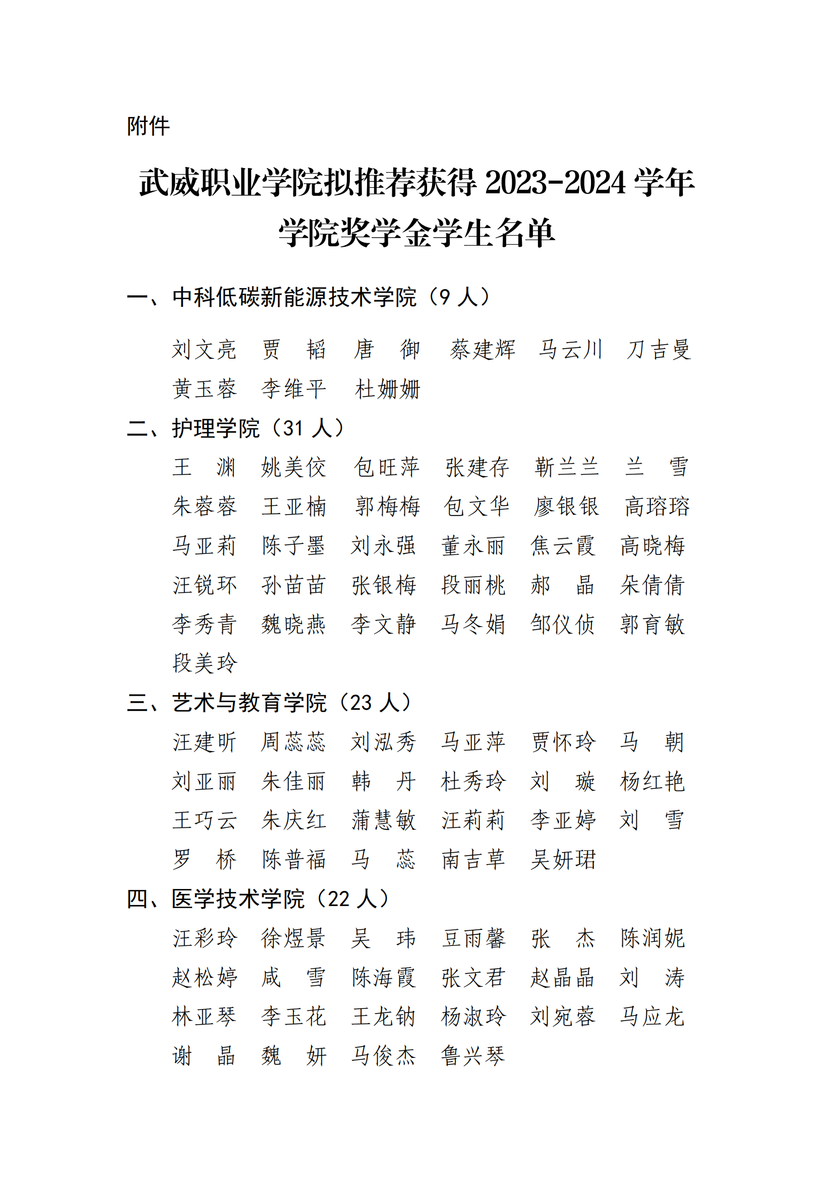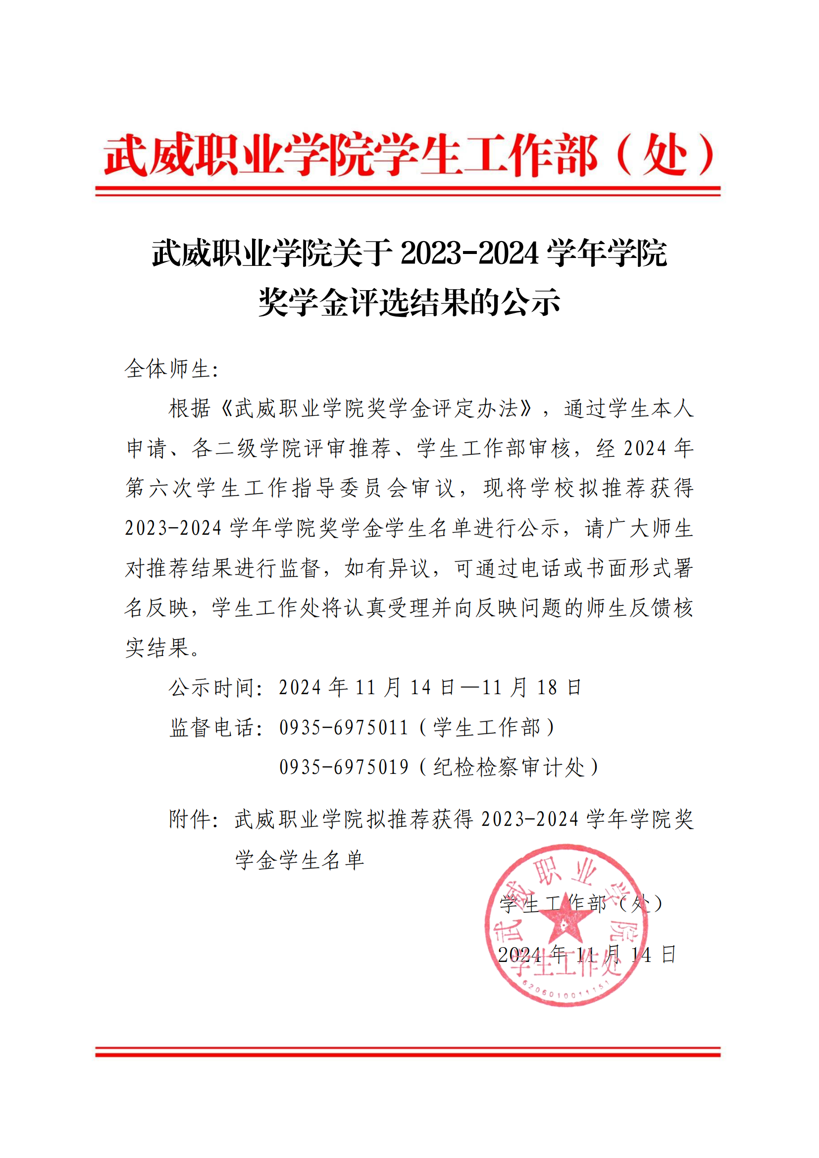 武威職業(yè)學(xué)院關(guān)于2023-2024學(xué)年學(xué)院獎學(xué)金評選結(jié)果的公示