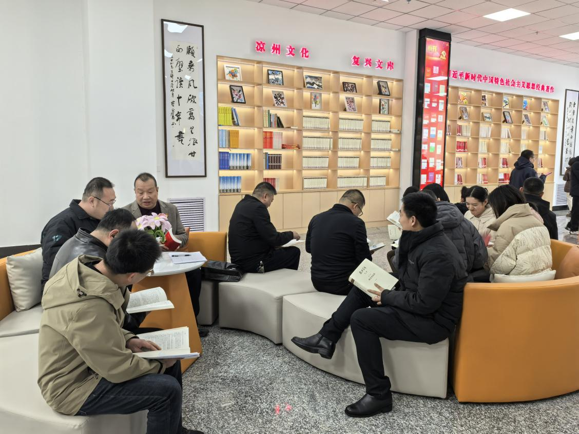 黨員們圍坐在書架旁,認(rèn)真閱讀關(guān)于習(xí)近平新時代中國特色社會主義思想書籍。書籍涵蓋了黨的創(chuàng)新理論、實踐探索、歷史經(jīng)驗等多方面內(nèi)容。閱讀結(jié)束后,全體黨員在研討交流室集中觀看了視頻《中國共產(chǎn)黨人精神譜系》,并開展了研討。