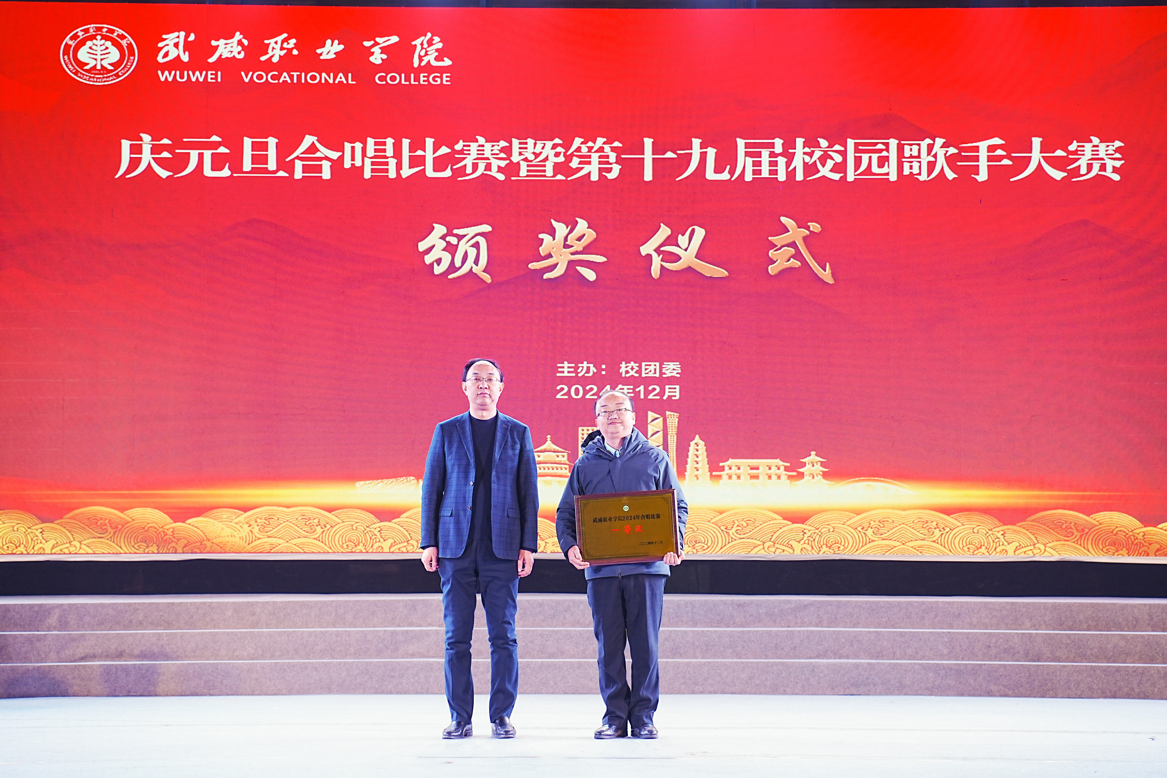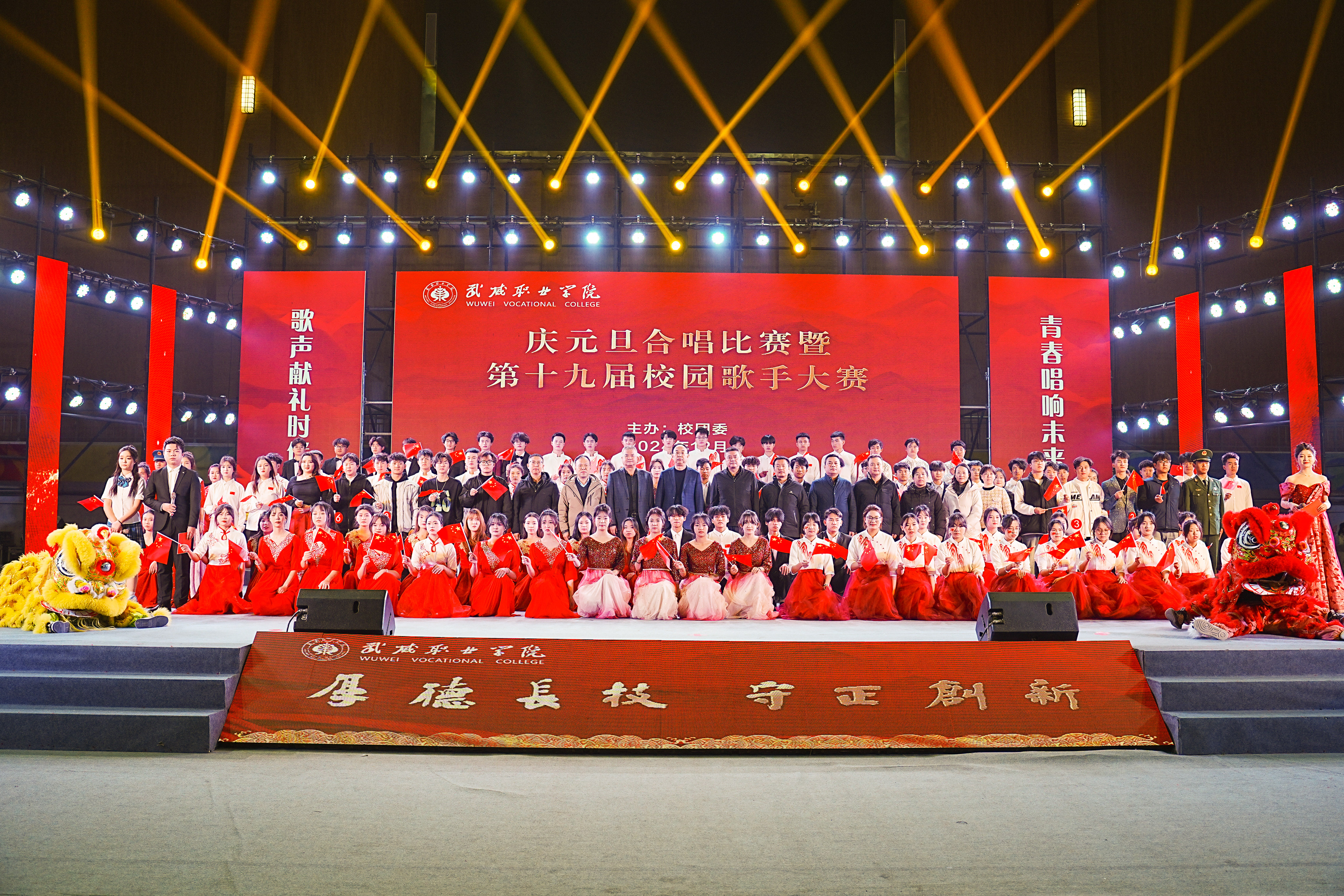 歌聲獻禮時代,青春唱響未來。12月26日晚,學(xué)?!皯c元旦”合唱比賽暨第十九屆校園歌手大賽在體育館成功舉辦。學(xué)校黨委書記王宏出席活動并為獲獎集體和個人頒獎,黨委委員、副校長王守云出席活動,各二級學(xué)院和相關(guān)部門負責(zé)人與2000余名師生現(xiàn)場觀看了比賽。