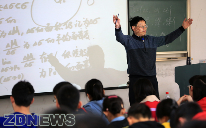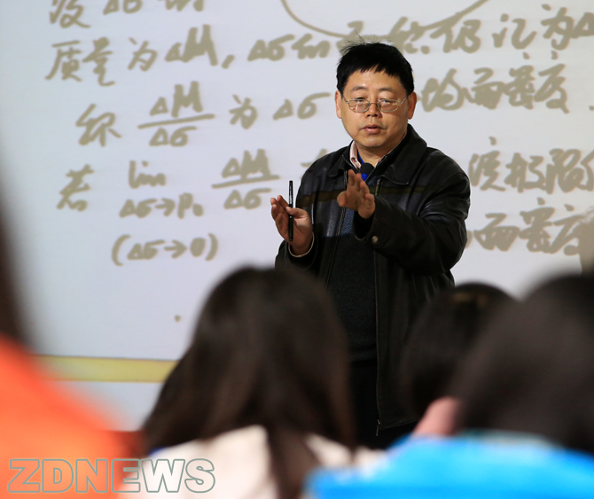 現(xiàn)在,蘇德礦上課用兩個話筒,一個掛在脖子上,一個放在講臺上,無論學生坐在哪個角落,都能聽得清楚。他還像一個“舞臺監(jiān)督”一樣嚴格布置環(huán)境:教室第一排的窗簾必須拉上,以免大屏幕反光;幻燈片的紙片要用油性筆書寫,這樣投影到屏幕上的效果最清晰。——這樣的布局,就是能為學生能穩(wěn)定他們的注意力設計的,特別是,當他們感覺“犯難”時,蘇德礦能適時拋上一個“段子”,把學生分散的注意力拉回來: “當你喜歡一個人,他的一點變化你都看在眼里,別人都變成了常數(shù),TA才是唯一變量。” 這是在講解偏導函數(shù);他還用“存錢存銀行還是存余額寶”來解釋函數(shù)里的重要極限概念。在講一元復合函數(shù)求導的時候,他用來解釋的例子是:“就像最近來天氣突然熱起來,你要脫衣服。脫到怎樣合適呢?一件一件脫,到不熱了為止。復合函數(shù)也一樣,一層一層求導,直到內(nèi)函數(shù)的導數(shù)有公式,就成了。”又比如,說“開車為什么會撞樹?因為朝著大樹的方向,再一個,就是車速太快。”蘇德礦先賣個了關子,接著把方向?qū)?shù)亮出來,“在P點沿L方向的函數(shù)值的變化率,跟撞樹一樣,一個是方向,一個是速度。”