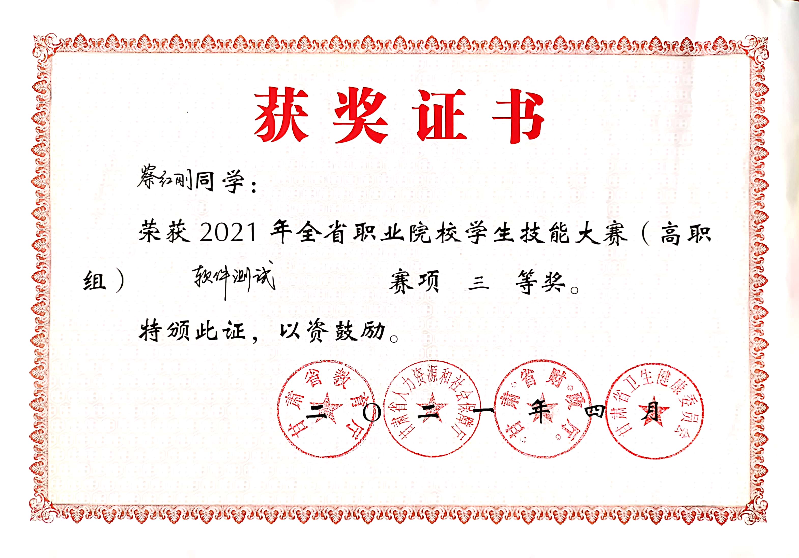 學(xué)生獲2021年全省職業(yè)院校學(xué)生技能大賽軟件測試三等獎(jiǎng)