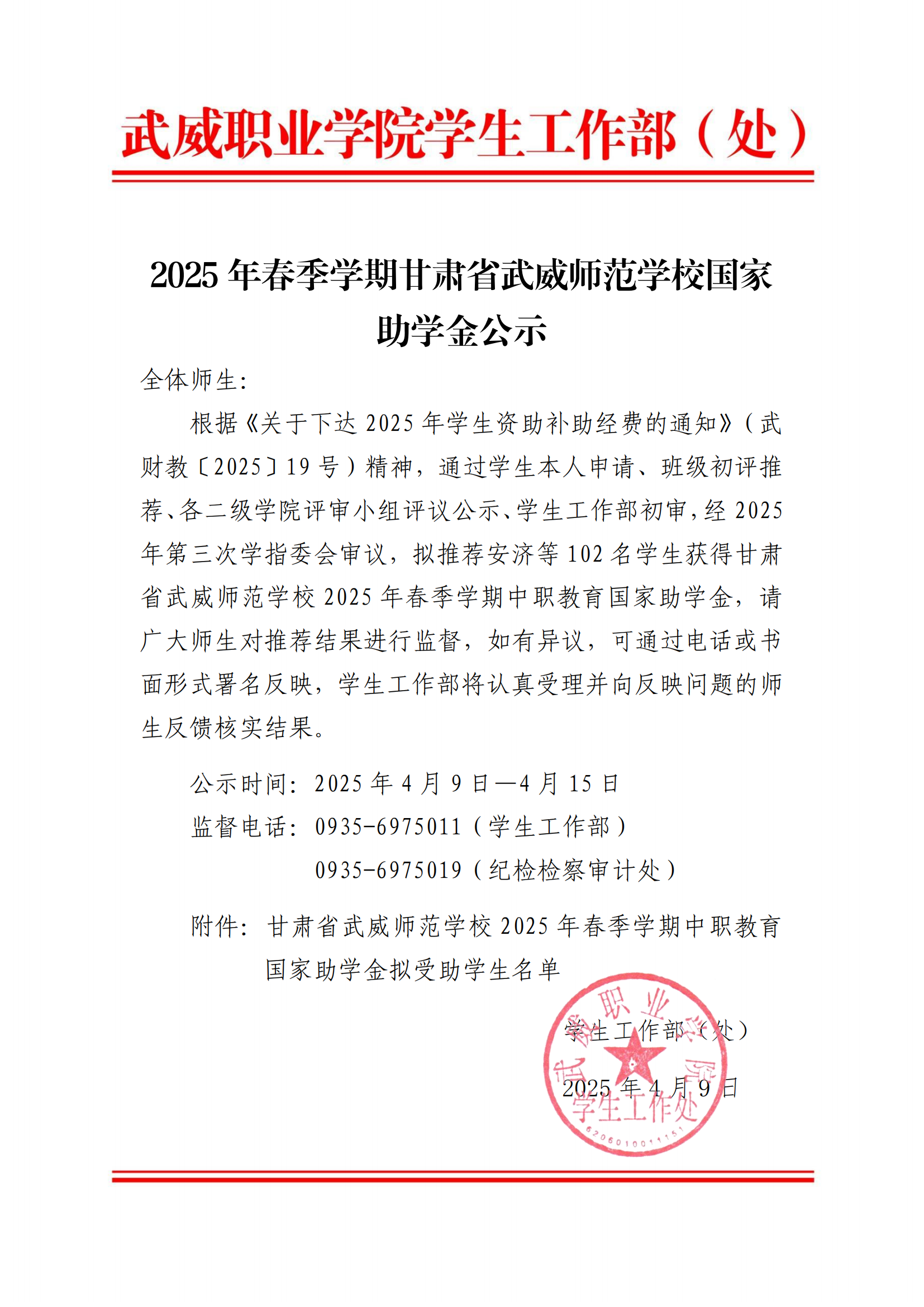 甘肅省武威師范學(xué)校關(guān)于2024-2025學(xué)年中職國家獎(jiǎng)學(xué)金候選人的公示
