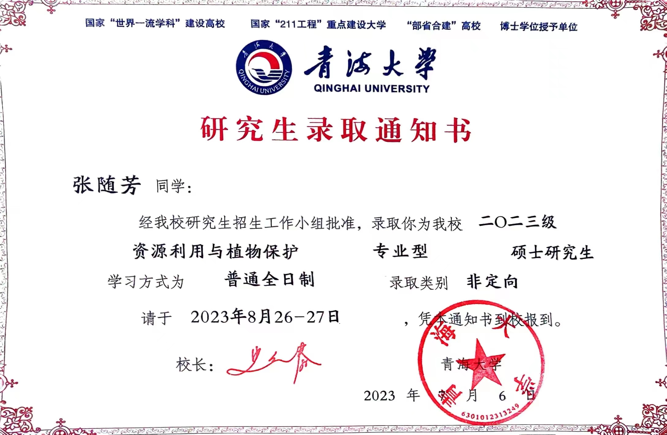 張隨芳,2018級(jí)植物保護(hù)與檢疫技術(shù)大專(zhuān)班,2021年考取河西學(xué)院農(nóng)學(xué)本科專(zhuān)業(yè),2023年考取青海大學(xué)資源利用與植物保護(hù)專(zhuān)業(yè)碩士研究生。
