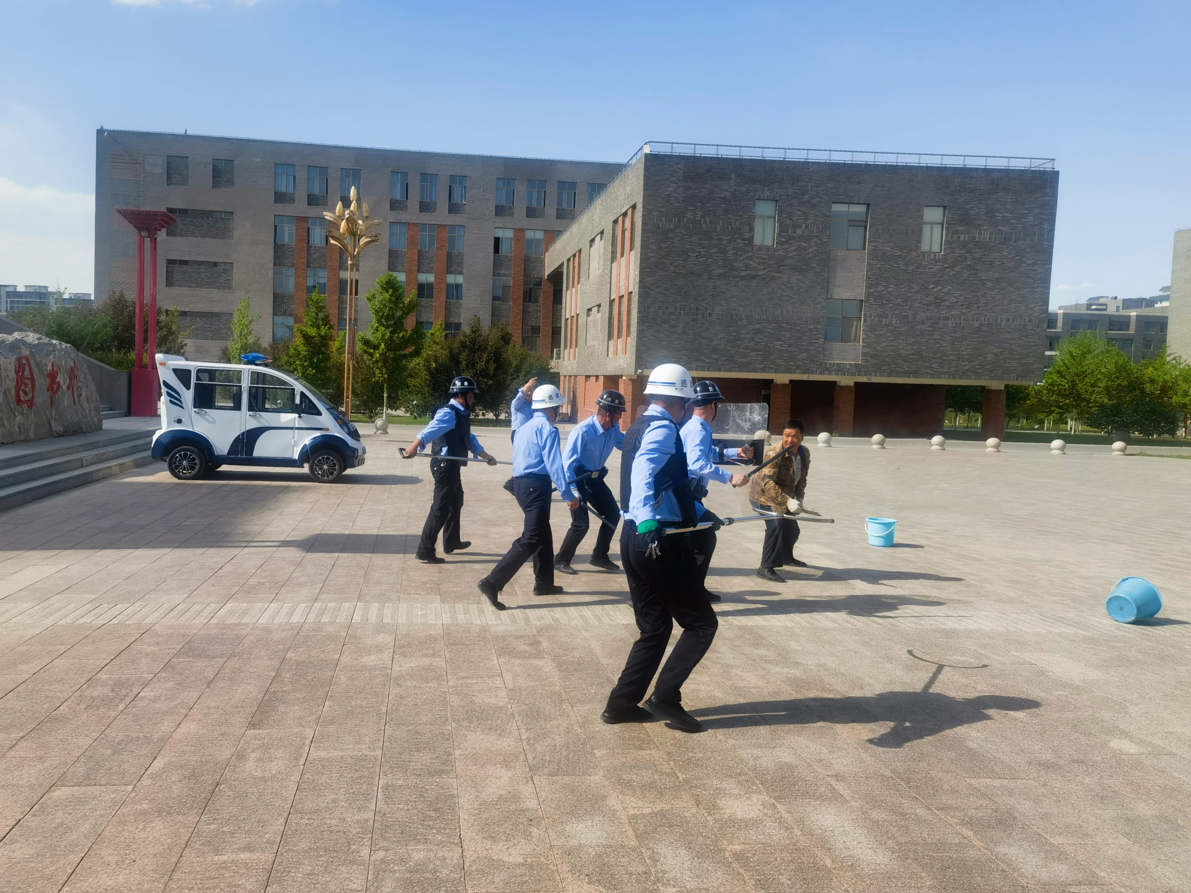為進(jìn)一步增強師生反恐防暴意識,提升安保人員應(yīng)急處置能力,筑牢校園安全防線,5月15日,學(xué)校安全保衛(wèi)處聯(lián)合轄區(qū)派出所在圖書館東側(cè)廣場組織開展了反恐防暴應(yīng)急演練。