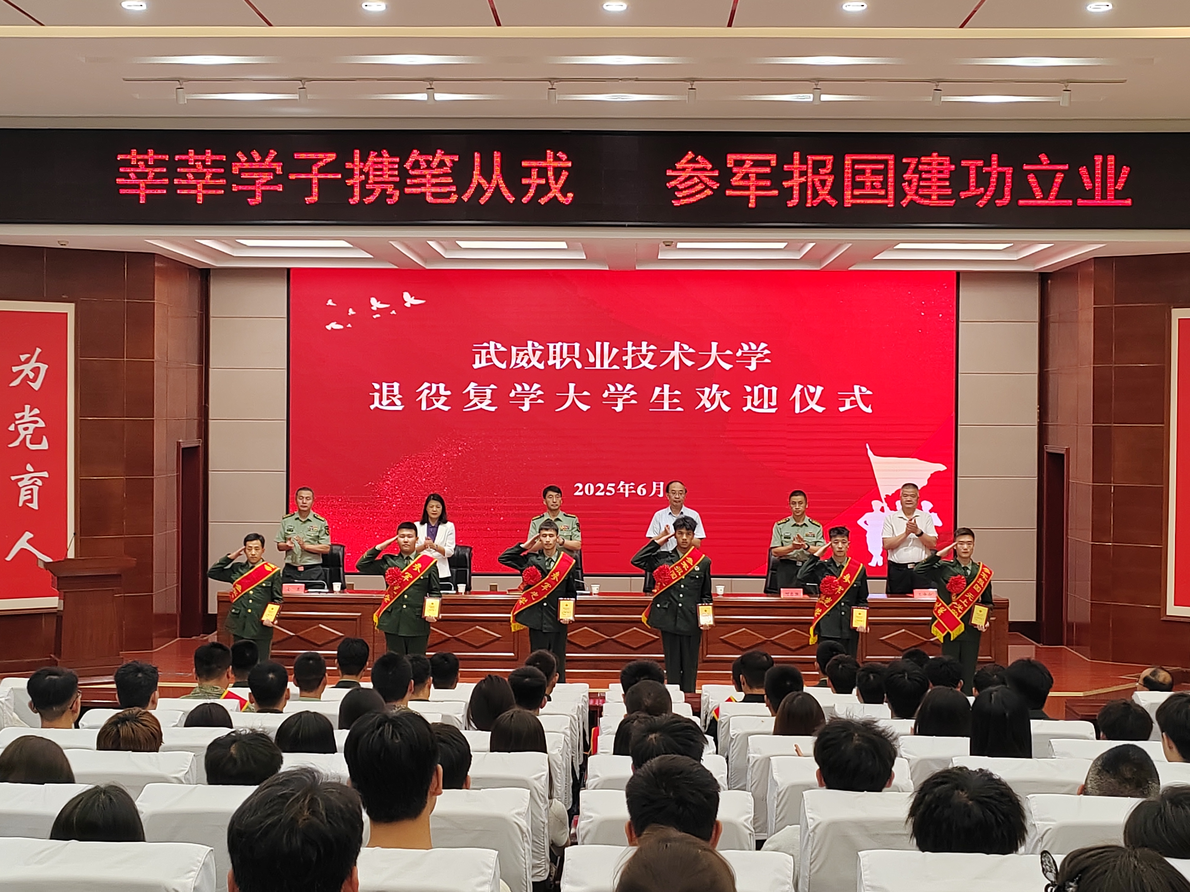 6月26日,武威市2025年征兵宣傳進高?;顒釉趯W校成功舉辦,市委常委、武威軍分區(qū)大校司令員陳習友,黨委書記王宏,武威軍分區(qū)動員處上校處長何志強,武威市教育局副局長馬曉麗,涼州區(qū)人武部上校部長金鑫出席活動。駐武部隊官兵代表、學校相關部門、二級學院負責人,輔導員及班主任代表,退役復學大學生及應征報名學生代表共200余人參加了活動?;顒佑牲h委委員、副校長王守云主持。