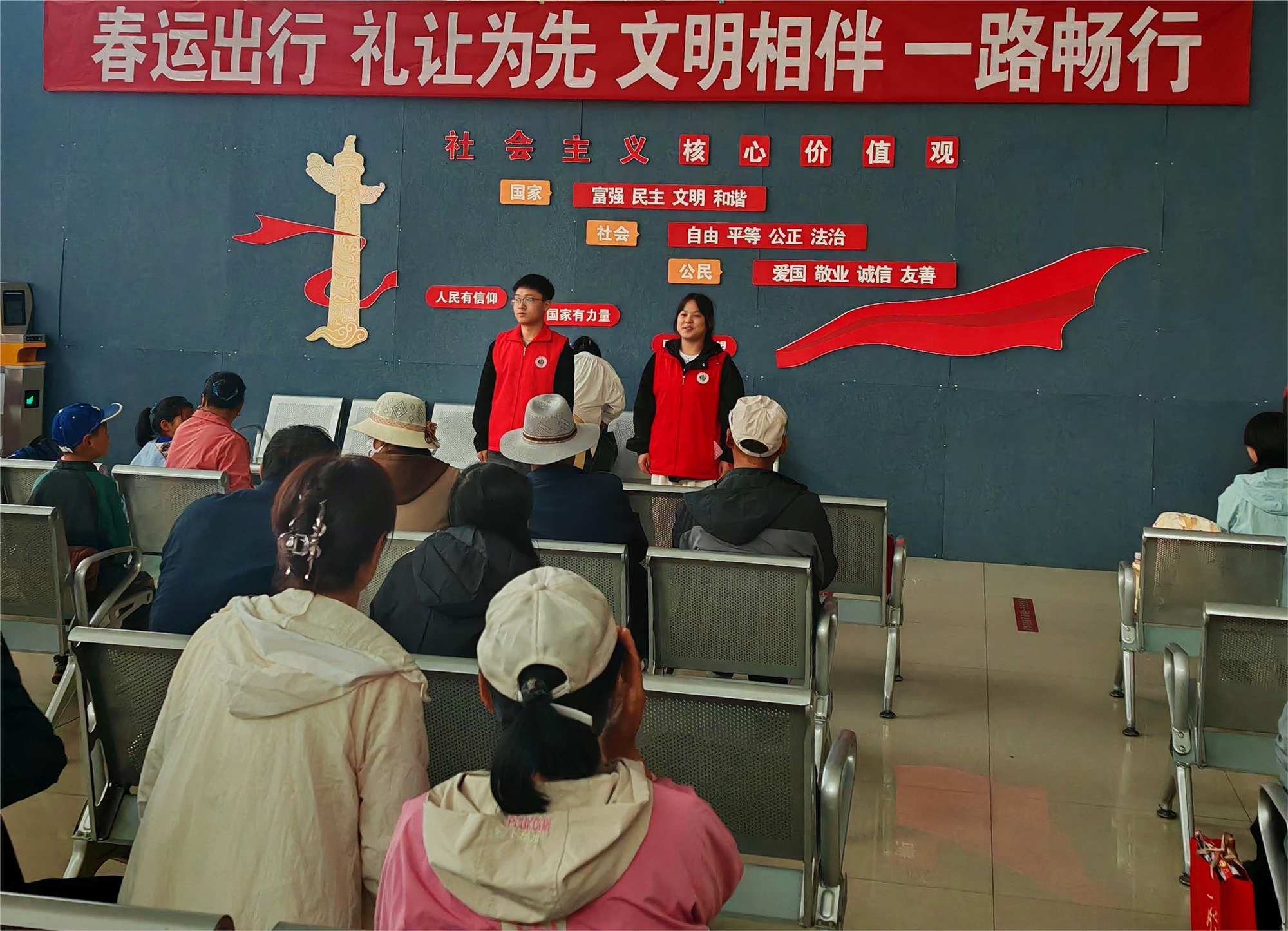 活動現(xiàn)場,志愿者們通過豐富多彩的形式推廣普通話,宣傳文明交通新風尚。在車站候車室,志愿者深情誦讀《祖國啊,我親愛的祖國》《黃河頌》等經(jīng)典篇目,吸引眾多候車乘客駐足聆聽。志愿者邀請車站內(nèi)的小旅客們一同參與朗誦,在互動中感受語言文字的魅力,營造了濃厚的文化氛圍。此外,團隊還向乘客發(fā)放文明乘車、文明出行倡議書,倡導安全出行、文明乘車的良好風尚。