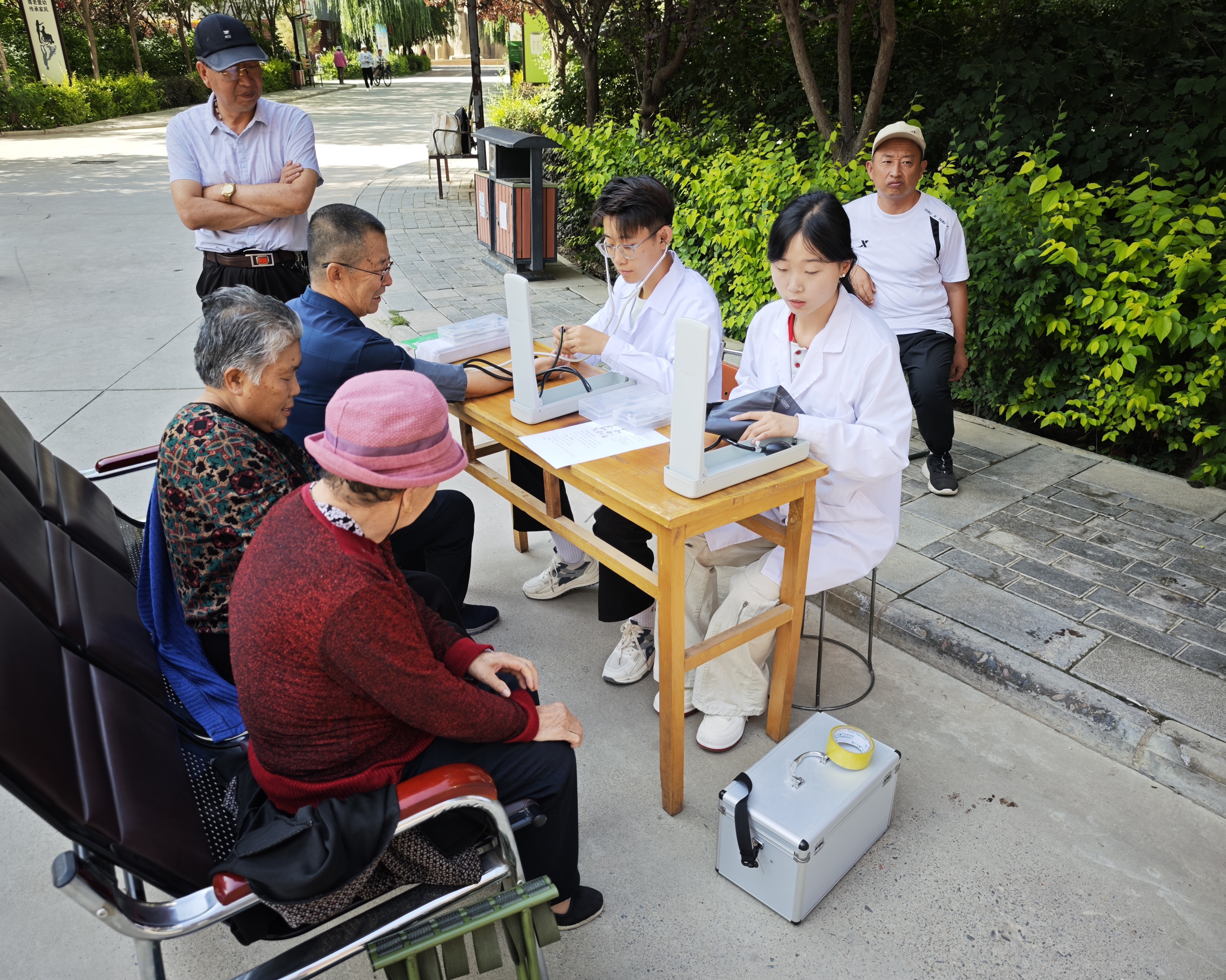 在指導(dǎo)老師的帶領(lǐng)下,志愿者們走進武威市涼州區(qū)窯溝村,他們手持血壓計為村民細心測量,指尖傳遞著溫暖的守護。針對常見的高血壓問題,志愿者們將書本的醫(yī)學(xué)知識化作“少鹽多醋常走動”的貼心叮嚀;艾灸棒在老人膝蓋處揮舞,老人們微闔雙眼,皺紋間舒展開寧靜的笑意。志愿者精心準(zhǔn)備了蘊含中藥智慧的五色香囊,讓預(yù)防保健的種子在老人們心中生根發(fā)芽。