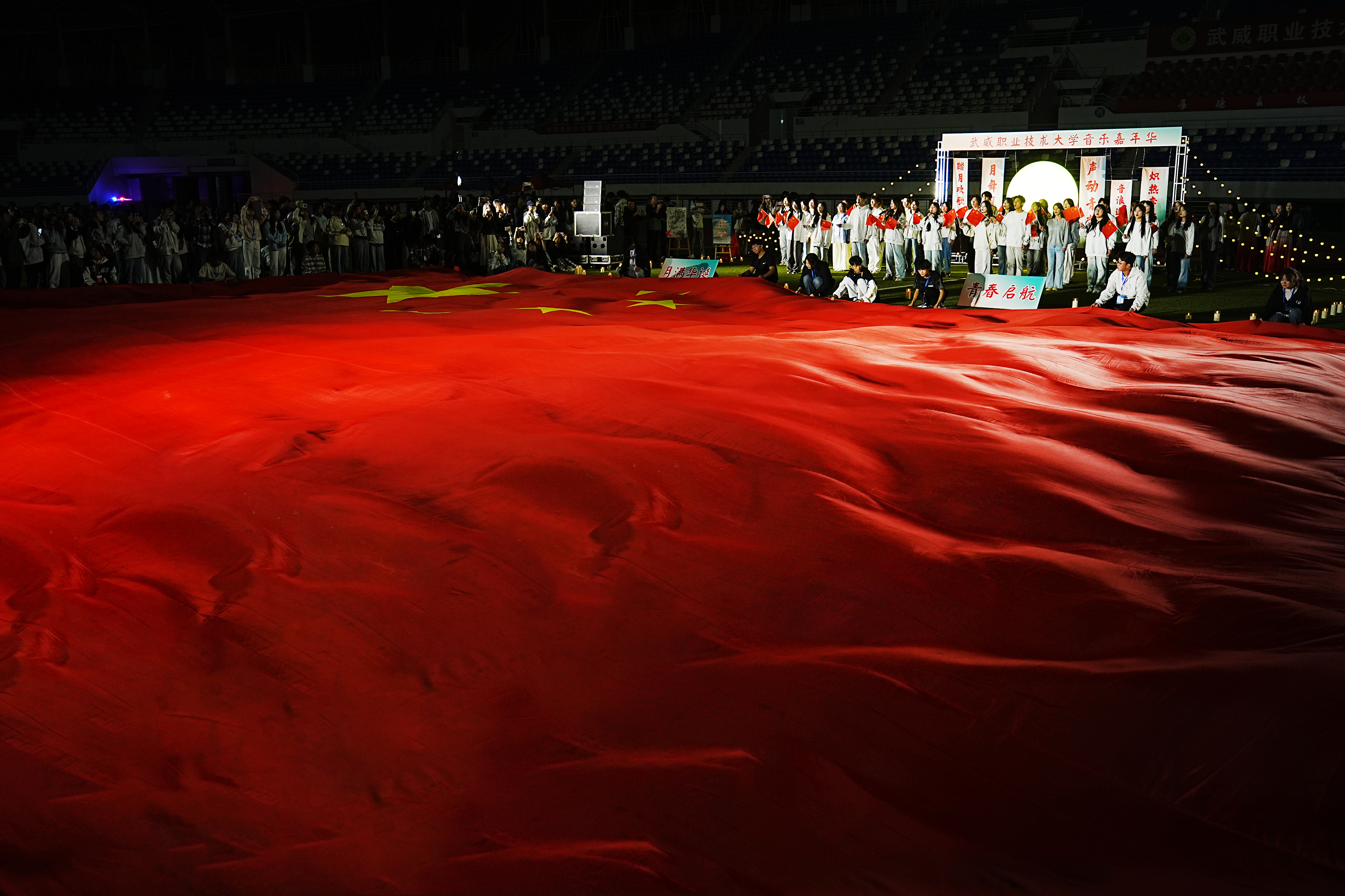 活動尾聲,在深情的旋律中,演職人員與觀眾齊聲合唱《如愿》,深切表達對國泰民安的美好祝愿。巨幅國旗在師生手中緩緩傳遞、飄揚舞動,匯成一片莊嚴(yán)而溫暖的紅色海洋,將現(xiàn)場氛圍推向最高潮,展現(xiàn)出青年一代與時代同頻、與祖國同行的堅定信念。