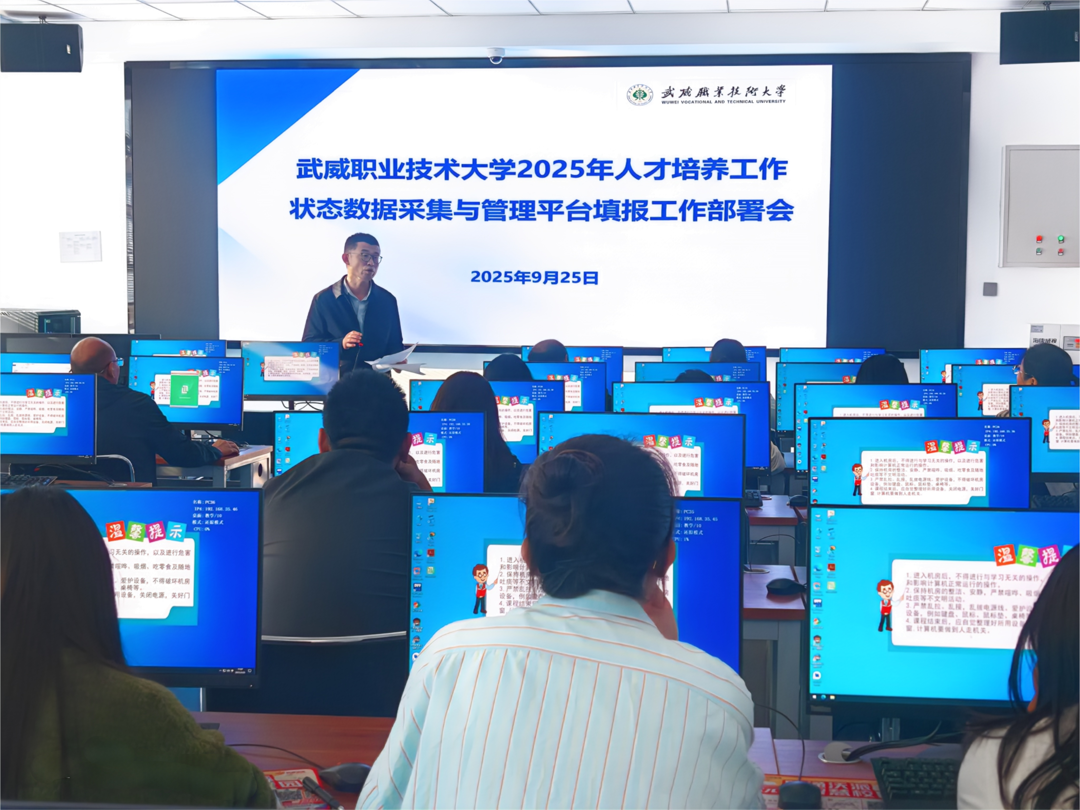 為深入貫徹落實(shí)教育部職成司《關(guān)于做好職業(yè)教育2024-2025學(xué)年數(shù)據(jù)采集工作的通知》精神,根據(jù)《甘肅省教育廳關(guān)于開展全省職業(yè)教育2024—2025學(xué)年信息數(shù)據(jù)采集工作的通知》要求,確保學(xué)校2025年人才培養(yǎng)工作狀態(tài)數(shù)據(jù)采集工作高效、有序開展。9月25日,教務(wù)處在篤行樓3樓機(jī)房組織召開學(xué)校2025年人才培養(yǎng)工作狀態(tài)數(shù)據(jù)采集工作部署會(huì)議。教務(wù)處、各學(xué)院(部)數(shù)據(jù)填報(bào)相關(guān)工作人員參加會(huì)議。