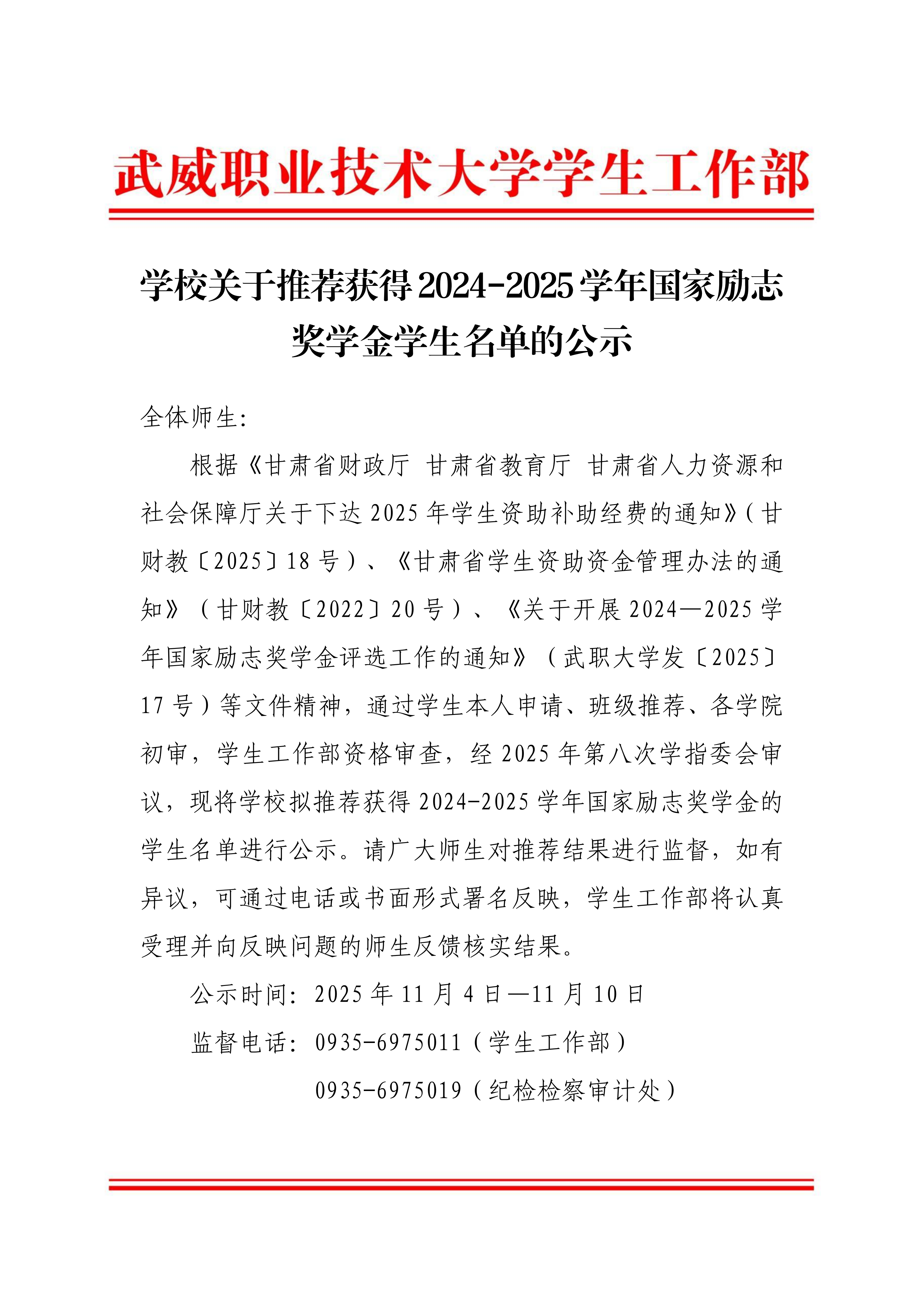 學(xué)校關(guān)于推薦獲得2024-2025學(xué)年國家勵(lì)志獎(jiǎng)學(xué)金學(xué)生名單的公示