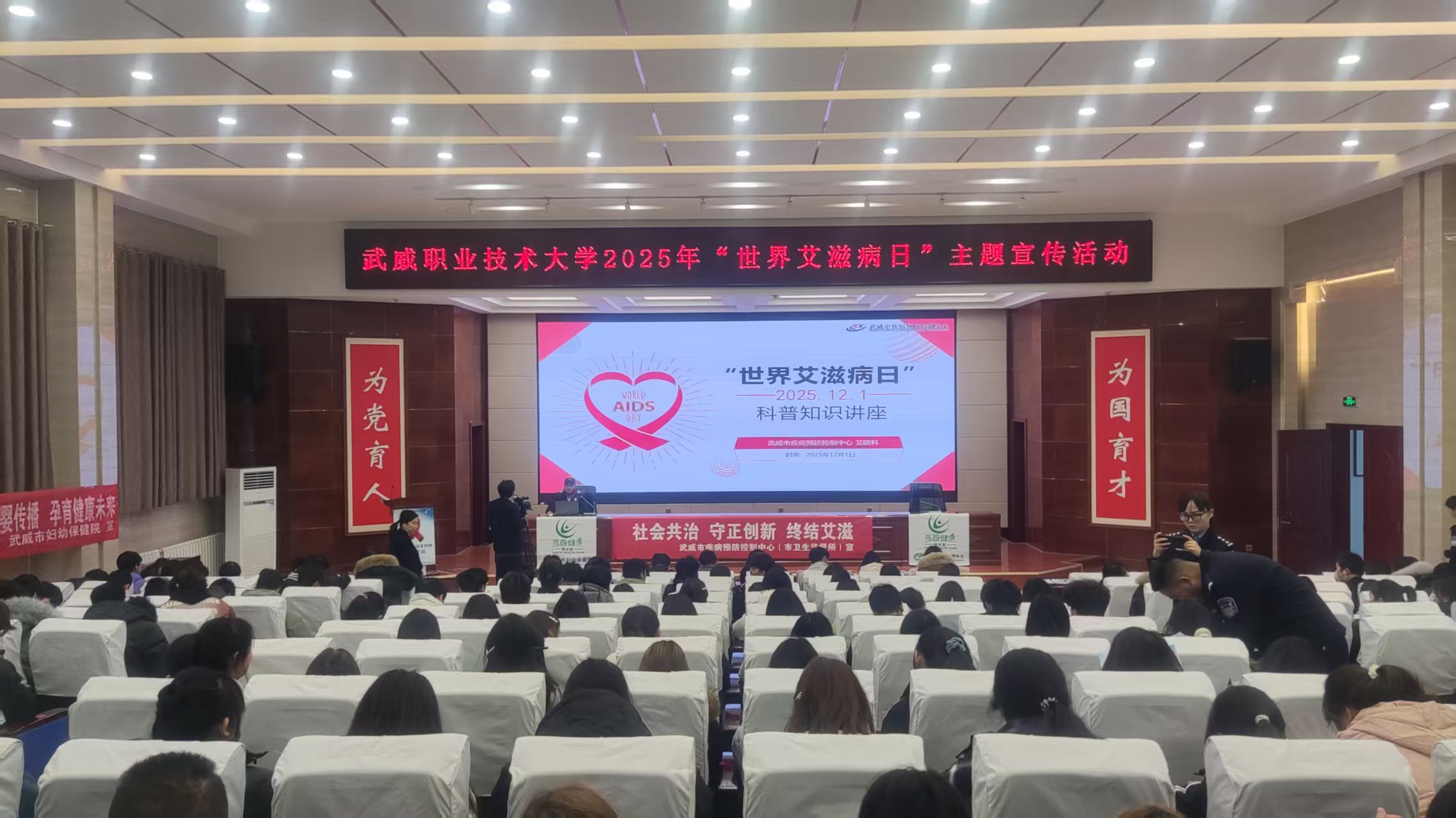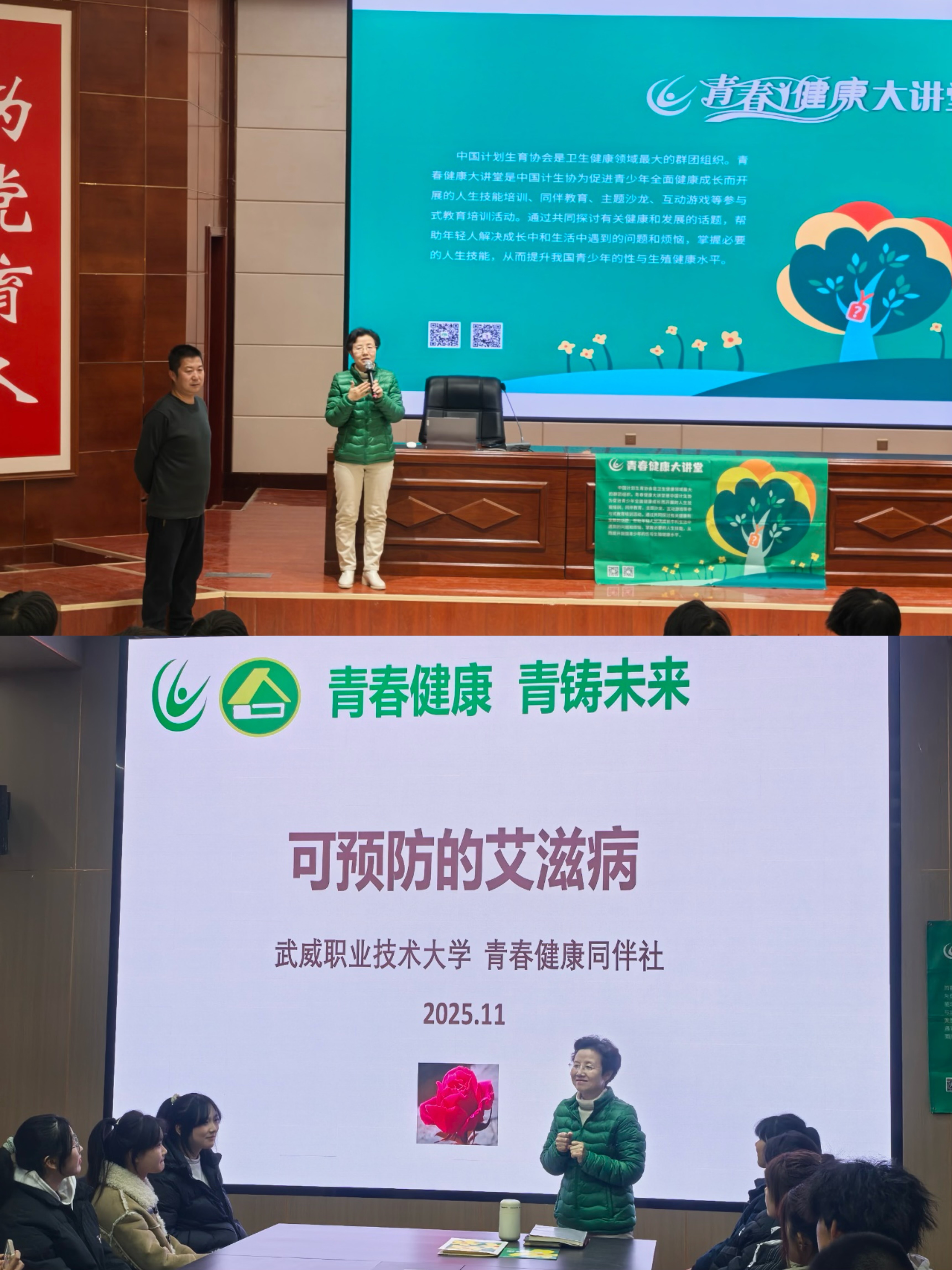 當(dāng)天的主題宣傳活動(dòng)內(nèi)容豐富,形式多樣?;顒?dòng)伊始,“知艾防艾”專題講座在菁英廳率先開講。講座特邀武威市疾病預(yù)防控制中心艾防科負(fù)責(zé)人王向尚與武威市人民醫(yī)院的皮膚科副主任醫(yī)師李杉擔(dān)任主講嘉賓。專家們結(jié)合一線工作實(shí)際經(jīng)驗(yàn),用翔實(shí)的數(shù)據(jù)和鮮活的案例,生動(dòng)講解了艾滋病的傳播途徑、預(yù)防措施、流行現(xiàn)狀以及反歧視理念,內(nèi)容深入淺出,貼近學(xué)生實(shí)際,有效幫助大家樹立起正確的防艾觀念,消除對艾滋病感染者的誤解與恐懼。