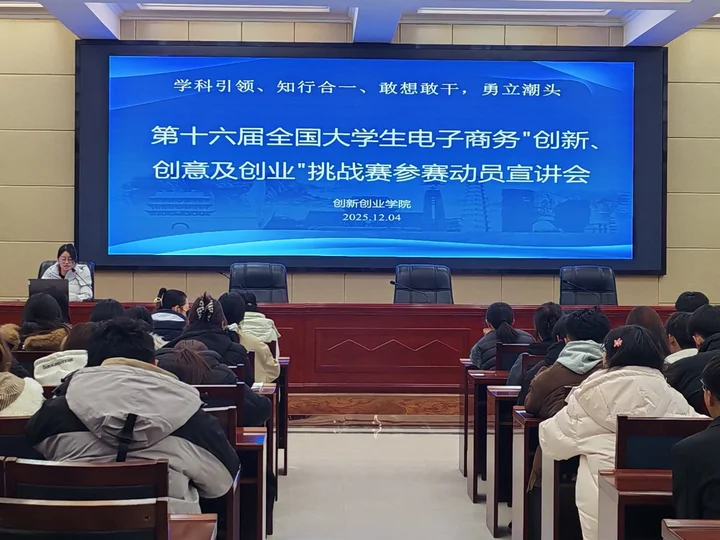 為積極備戰(zhàn)第十六屆全國大學(xué)生電子商務(wù)“創(chuàng)新、創(chuàng)意及創(chuàng)業(yè)”挑戰(zhàn)賽,激發(fā)學(xué)生參賽熱情,提升項(xiàng)目質(zhì)量,創(chuàng)新創(chuàng)業(yè)學(xué)院于12月4日在行樹樓北側(cè)報(bào)告廳舉行大賽動(dòng)員宣講會(huì)。來自全校9個(gè)學(xué)院的師生代表共計(jì)120人參加了本次動(dòng)員會(huì)。