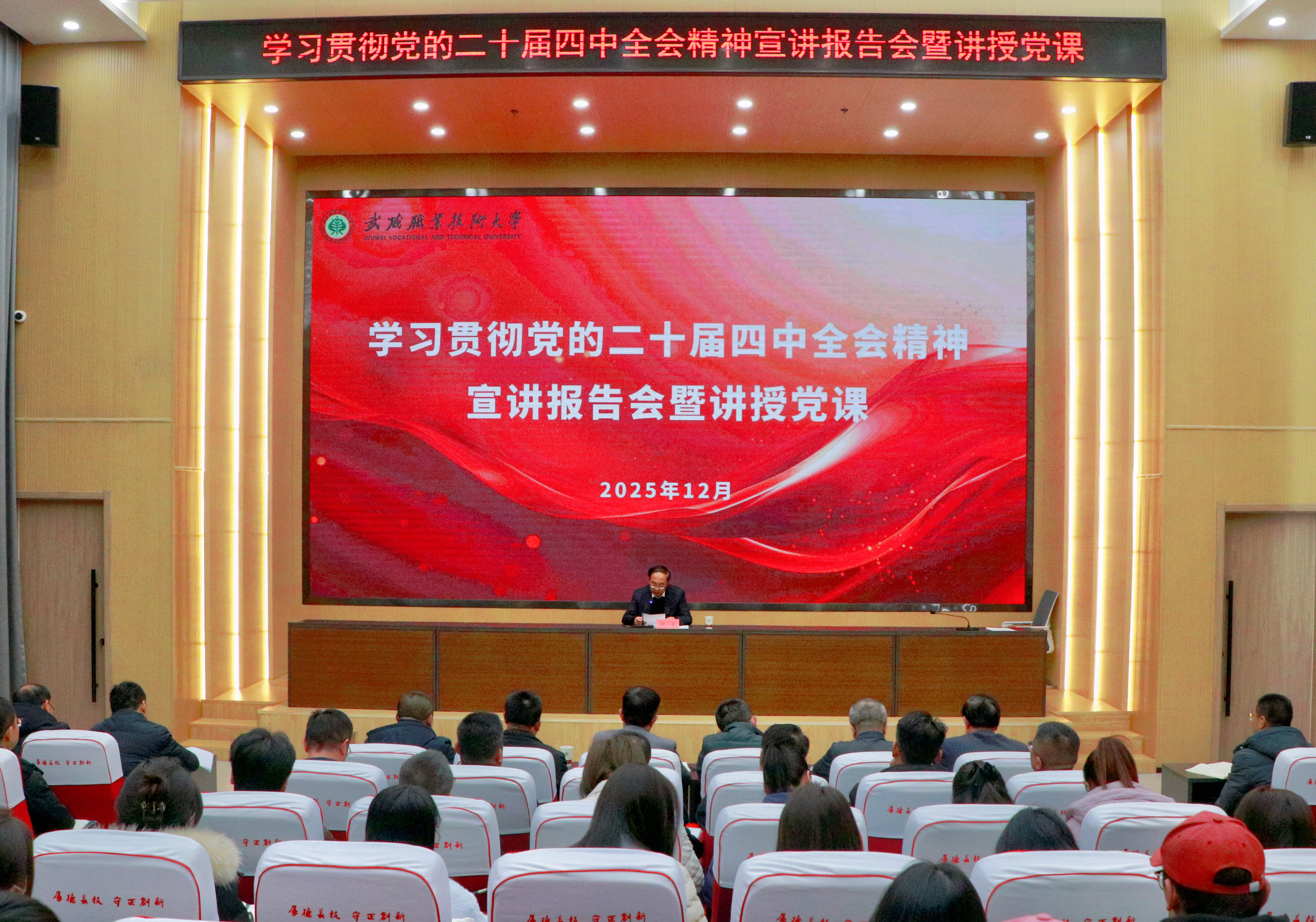 12月10日,黨委書記王宏專題宣講黨的二十屆四中全會精神,并向師生講授黨課。他強調,要深入學習貫徹黨的二十屆四中全會精神,全面把握核心要義,立足職業(yè)本科教育新起點,奮力譜寫學校高質量發(fā)展新篇章,為加快推進中國式現(xiàn)代化武威實踐貢獻智慧力量。黨委副書記、副校長張開禮主持報告會。