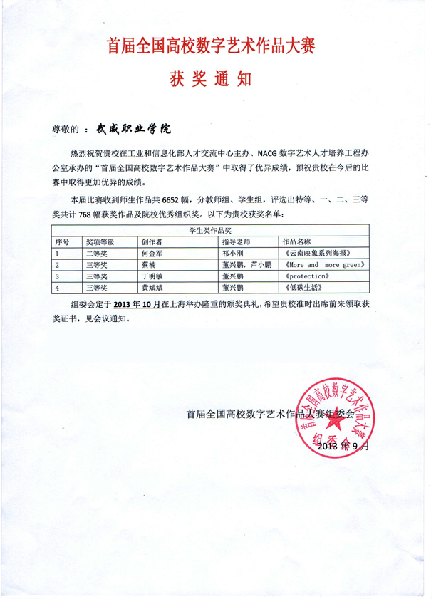 自合作以來,取得了較好的建設(shè)成果,共完成各類學生設(shè)計師認證110人次,組織10級動漫設(shè)計與制作專業(yè)學生赴上海參加崗位實訓1次,培訓認證教師12人。在2013年6月由工業(yè)和信息化部人才交流中心主辦的“首屆全國高校數(shù)字藝術(shù)作品大賽”中,我院藝術(shù)系10級圖形圖像制作專業(yè)學生何金軍、10級電腦藝術(shù)設(shè)計專業(yè)學生蔡楠、丁明敏、黃斌斌、分獲二等獎和三等獎。