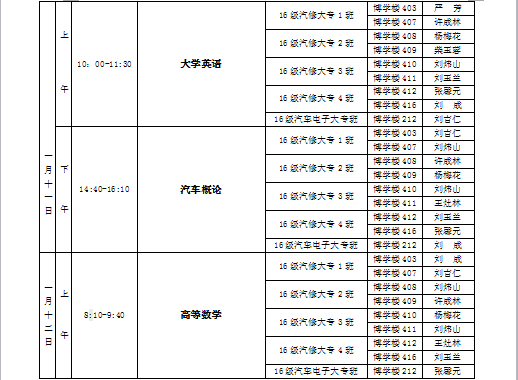汽車工程系2016-2017學(xué)年第一學(xué)期期末考試監(jiān)考安排