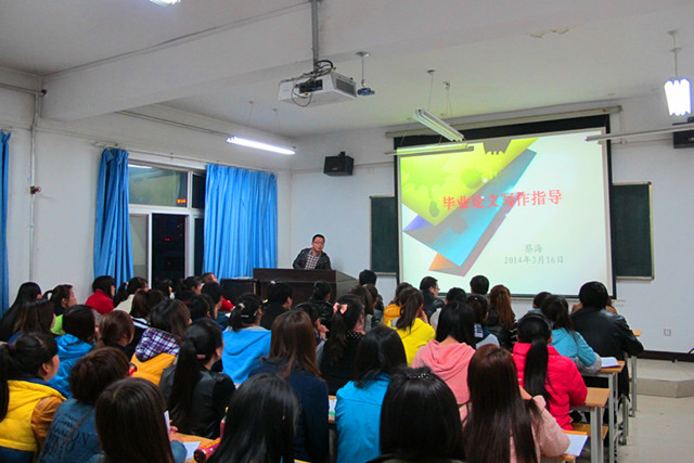 系主任晏素珍對(duì)本次畢業(yè)生畢業(yè)論文(設(shè)計(jì))做了三點(diǎn)要求,一是全體畢業(yè)生要高度重視畢業(yè)論文(設(shè)計(jì))的寫(xiě)作;二是嚴(yán)格按照指導(dǎo)教師的要求保質(zhì)保量的完成論文;三是每位指導(dǎo)老師對(duì)論文指導(dǎo)工作要認(rèn)真負(fù)責(zé)、耐心細(xì)致。蔡海老師做了題為《畢業(yè)生論文寫(xiě)作指導(dǎo)》的報(bào)告,主要從論文格式要求、文獻(xiàn)查詢方法、論文寫(xiě)作方法三個(gè)方面給同學(xué)們做了深入淺出的講解,受到同學(xué)們的熱烈歡迎。
