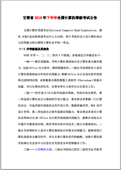 5.詳細(xì)信息請(qǐng)參看甘肅省教育考試院《關(guān)于做好2016年9月全國(guó)計(jì)算機(jī)等級(jí)考試網(wǎng)上報(bào)名工作的通知》(甘教考院〔2016〕95號(hào)文件)及《甘肅省2016下半年全國(guó)計(jì)算機(jī)等級(jí)考試公告》(已傳至群文件)。