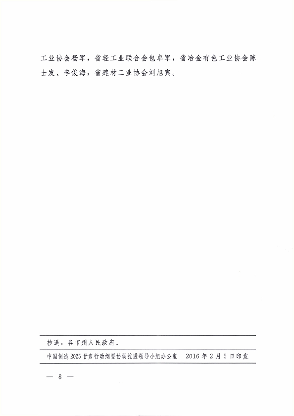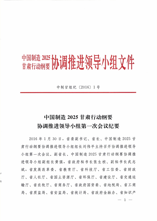 2016 年 1 月 30 日,省委副書記、省長(zhǎng)、中國(guó)制造 2025甘肅行動(dòng)綱要協(xié)調(diào)推進(jìn)領(lǐng)導(dǎo)小組組長(zhǎng)劉偉平主持召開了協(xié)調(diào)推進(jìn)領(lǐng)導(dǎo)小組第一次會(huì)議,研究部署我省行動(dòng)綱要的協(xié)調(diào)和推進(jìn)工作?,F(xiàn)將《中國(guó)制造 2025 甘肅行動(dòng)綱要協(xié)調(diào)推進(jìn)領(lǐng)導(dǎo)小組第一次會(huì)議紀(jì)要》轉(zhuǎn)發(fā)你們。