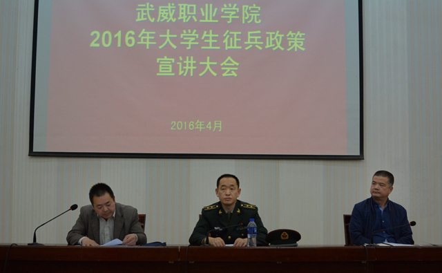 為支持國防建設,鼓勵大學生參軍入伍保家衛(wèi)國,學院于4月14日下午在尚德樓正德廳召開了2016年大學生應征入伍政策宣講暨動員大會。學生工作處負責人王守云主持會議,涼州區(qū)人民武裝部政治工作科科長趙輝泉、涼州區(qū)西關街政法書記趙光慶到場宣講。學院280多名師生參加了宣講大會。