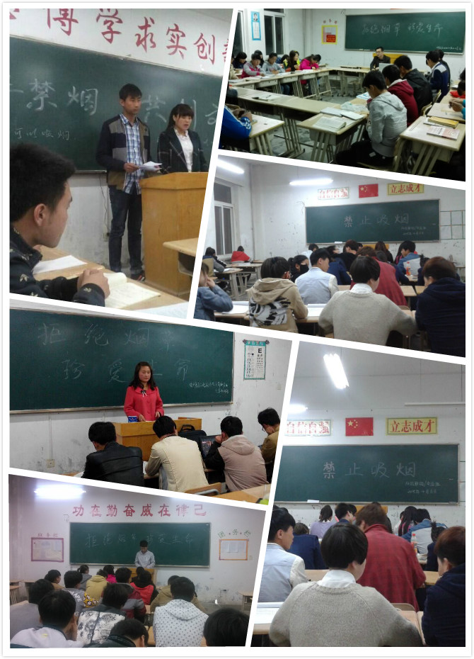 在班會中,各班主任向同學(xué)們宣讀了學(xué)院《關(guān)于在校園內(nèi)公共場所戒煙的通知》和《校園禁煙倡議書》,并提出作為一名學(xué)生,除了要有遠(yuǎn)大的理想、高尚的情操、淵博的知識、嚴(yán)謹(jǐn)?shù)募o(jì)律作風(fēng)外,還要有一個健康的身體。為了我們的健康,我們呼吁,同學(xué)們應(yīng)自覺的遠(yuǎn)離香煙,并勸說吸煙的親友盡快戒煙。讓我們每一位同學(xué)做出承諾,自覺拒絕煙草,遠(yuǎn)離煙草危害。堅決不吸煙,拒吸第一支煙,勸告他人不吸煙,不做吸煙的新一代。人人爭做文明、健康、遵紀(jì)守法的好學(xué)生,使每一位師生都擁有一個健康的生活環(huán)境。