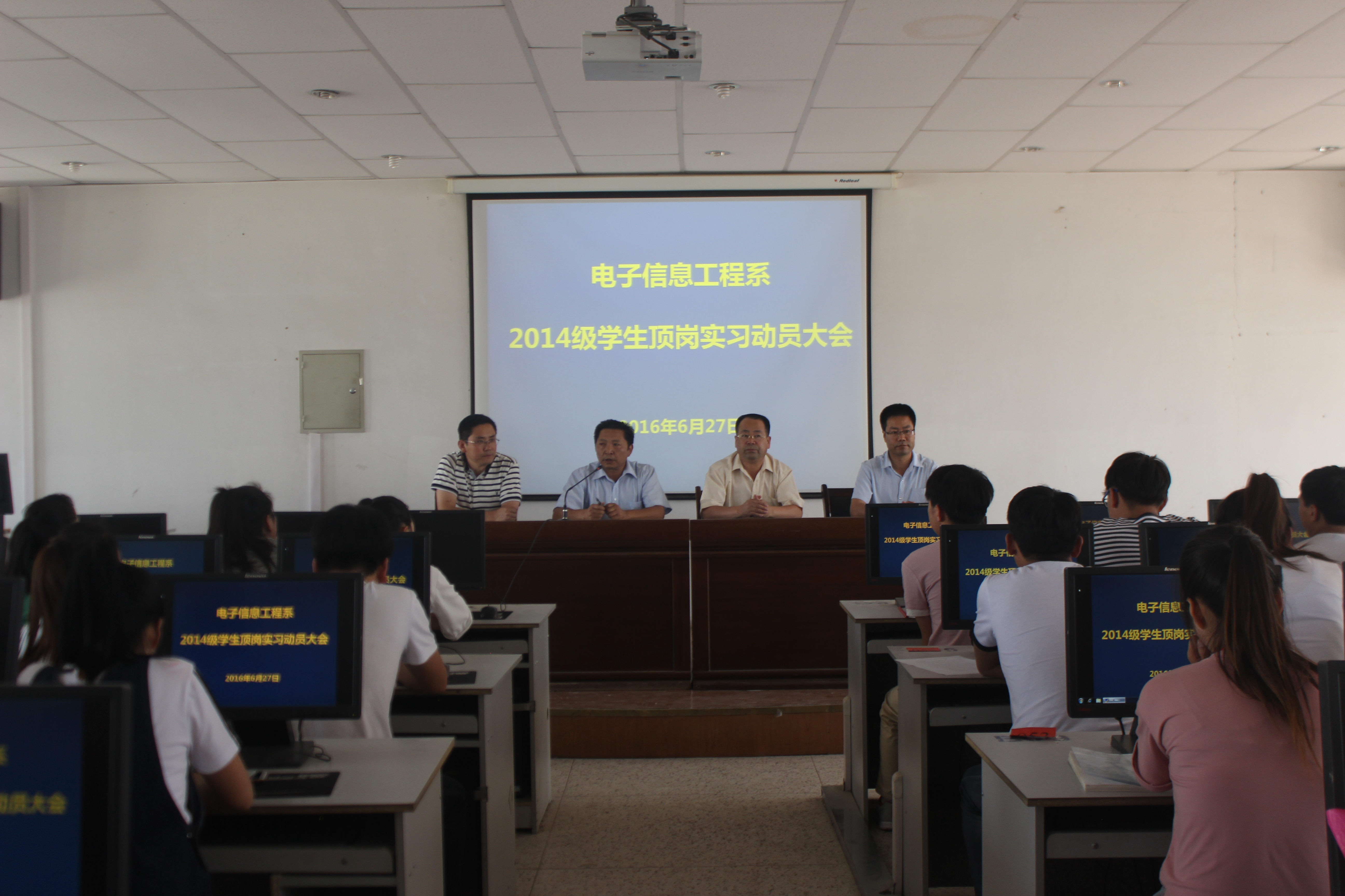 2016年6月27日下午3點,電子信息工程系2014級學(xué)生頂崗實習(xí)動員大會在尚德樓十一號機房舉行。系黨總支書記袁青年、系主任白玉珍、副書記張伯成,班主任鄧偉華、唐宗舜、孫麗山、陳平及2014級全體學(xué)生參加頂崗實習(xí)動員大會。