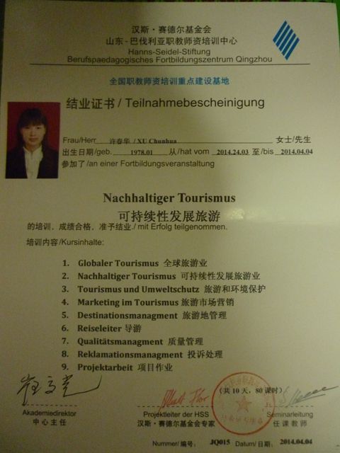2014年3月24日至4月4日,我院旅游管理專(zhuān)業(yè)骨干教師馬靜、許春華參加了德國(guó)漢斯·賽德?tīng)柣饡?huì)(Hanns Seidel Stiftung)在酒泉職業(yè)技術(shù)學(xué)院舉辦的“可持續(xù)性發(fā)展旅游”師資培訓(xùn)班。