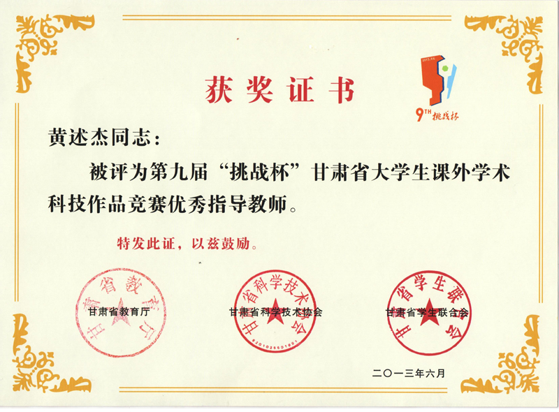 黃述杰榮獲第九屆“挑戰(zhàn)杯”甘肅省大學(xué)生課外學(xué)術(shù)科技作品競賽優(yōu)秀指導(dǎo)教師