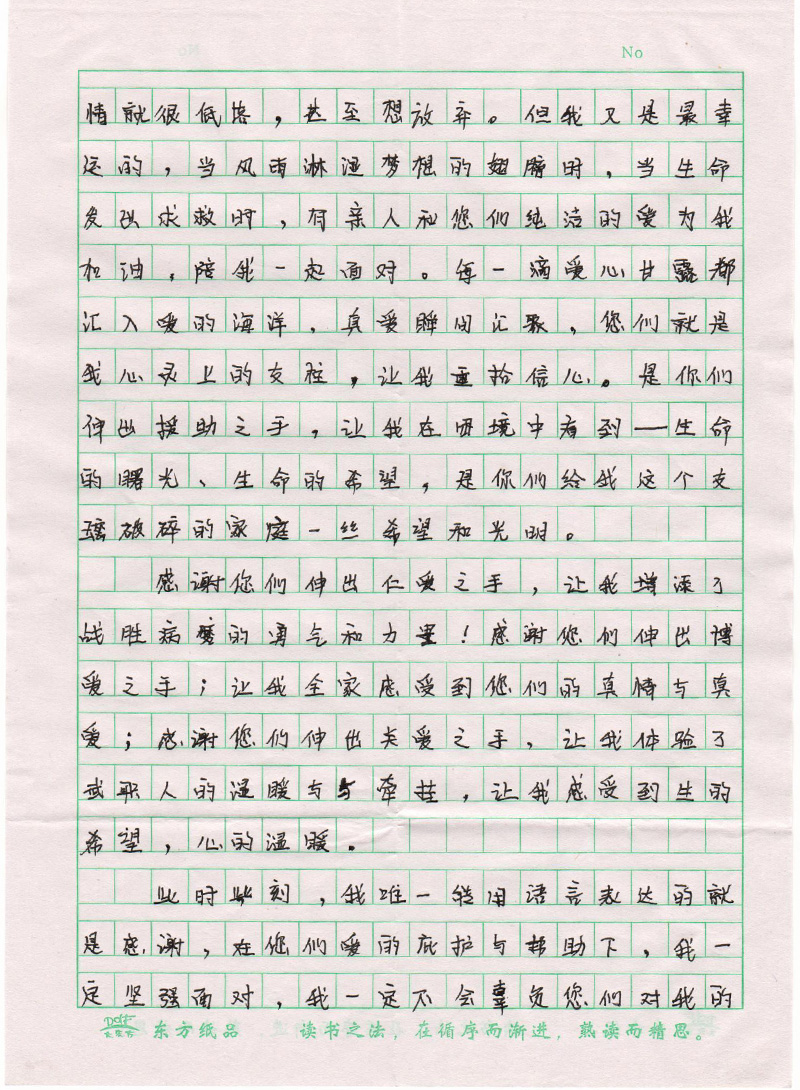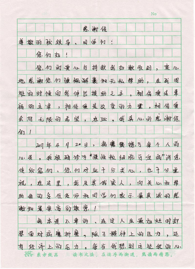 高國(guó)棟是我院機(jī)械制造系2015級(jí)機(jī)械設(shè)計(jì)與制造大專班學(xué)生,于2017年4月確診為慢性粒細(xì)胞白血病。得知這一特殊情況后,學(xué)院宣傳統(tǒng)戰(zhàn)部、團(tuán)委、學(xué)生工作處第一時(shí)間向全院廣大師生發(fā)出倡議,號(hào)召大家獻(xiàn)出愛心,幫助高國(guó)棟同學(xué)度過難關(guān)。學(xué)院廣大師生紛紛解囊,慷慨相助。目前捐助的善款已經(jīng)交給高國(guó)棟同學(xué)。為此,高國(guó)棟同學(xué)特意寫來感謝信,表達(dá)對(duì)母校廣大師生的感激之情。在此,我們衷心祝愿高國(guó)棟同學(xué)能在困境中迎難而上,樹立戰(zhàn)勝疾病的信心,爭(zhēng)取早日康復(fù),重返校園。