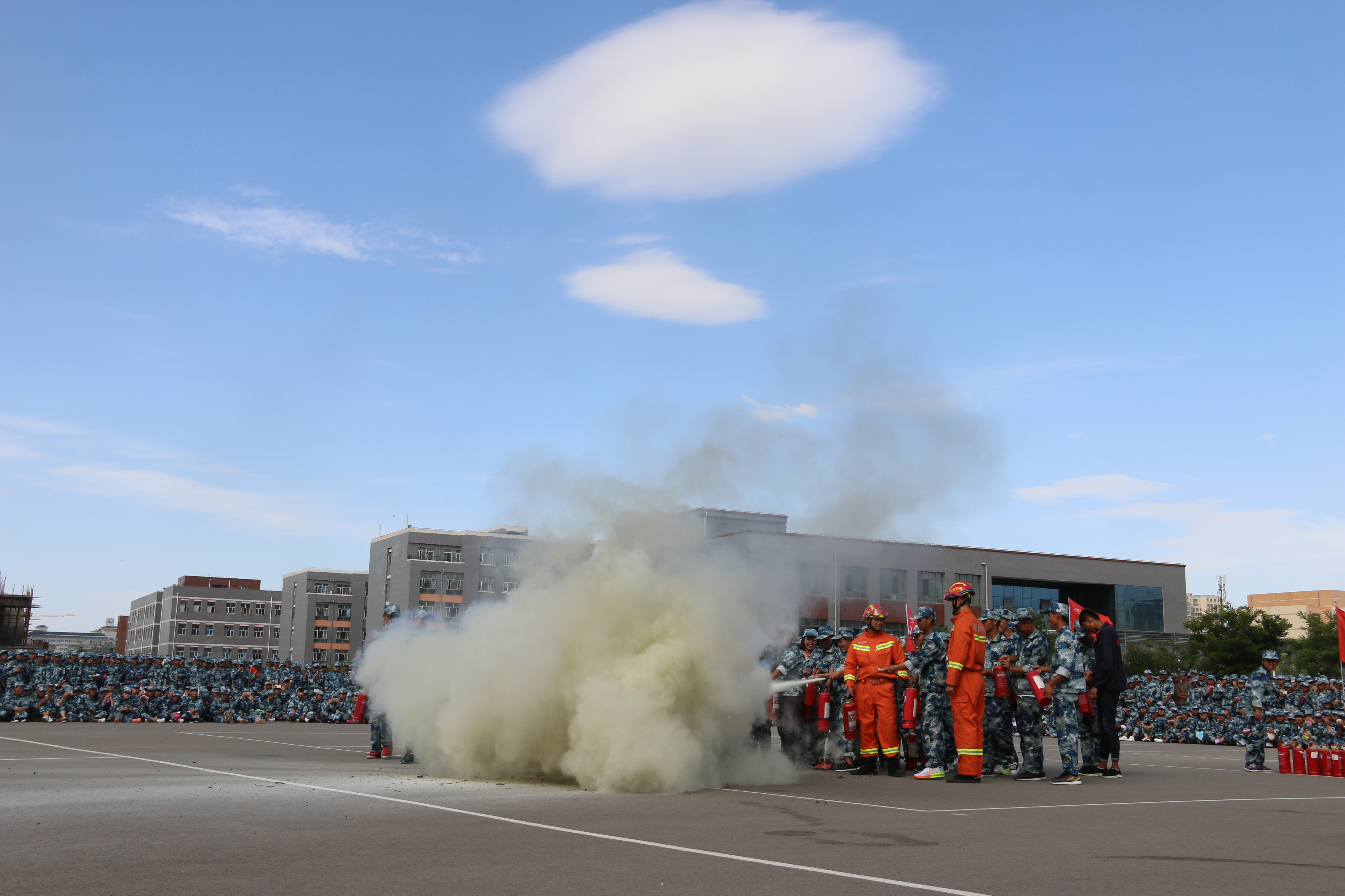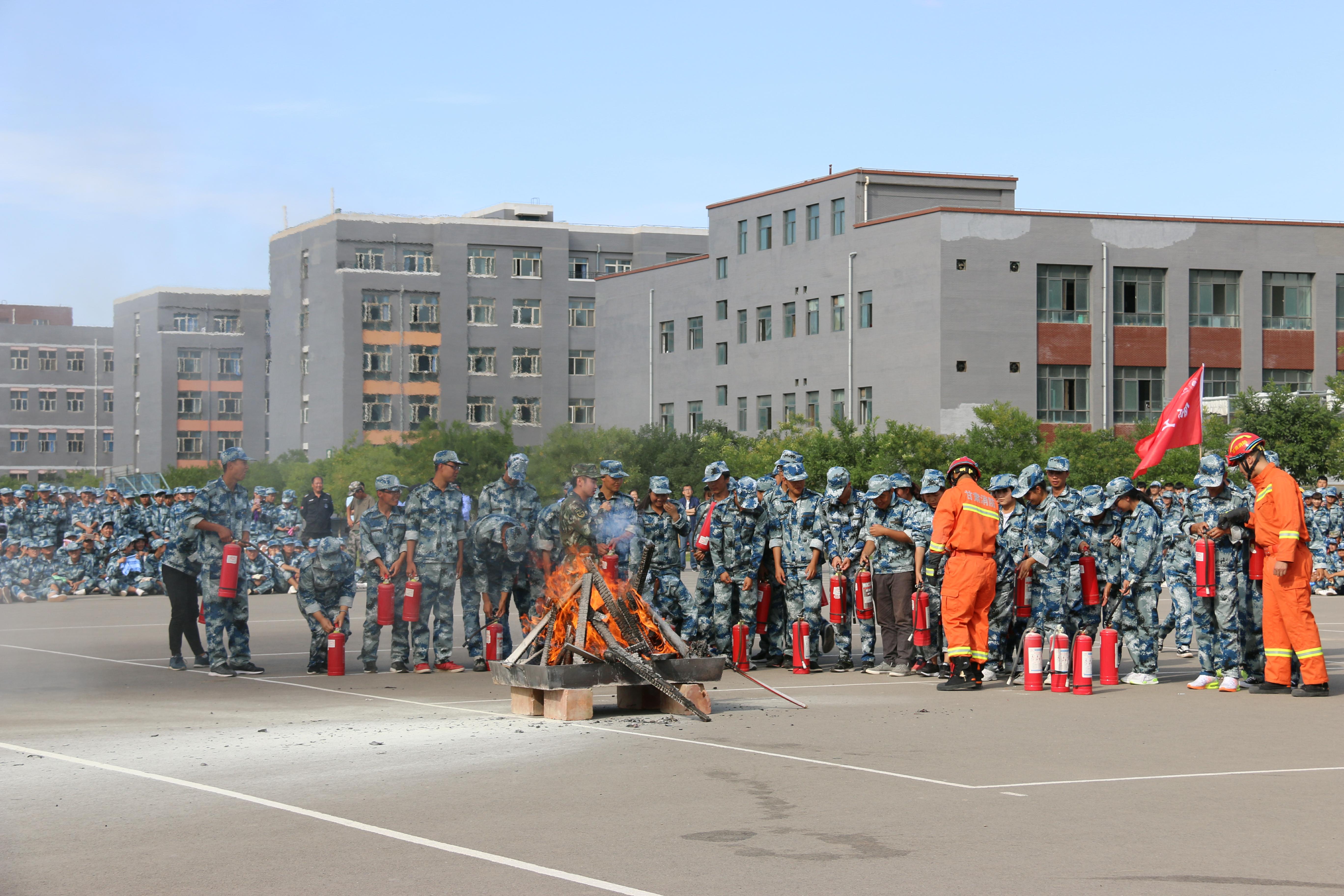 隨后,所有參演學生整隊到操場參加了滅火演練。在消防官兵的講解和和示范下,同學們體驗了處置著火液化氣瓶、干粉滅火器滅火,通過模型煙室等操作。