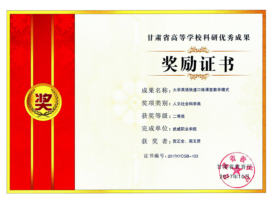 2017年度甘肅省高等學(xué)??蒲袃?yōu)秀成果獎勵證書