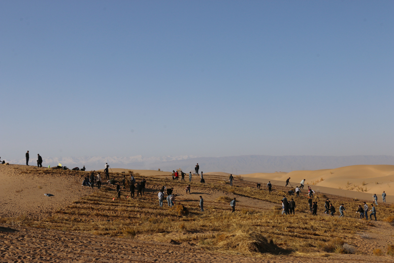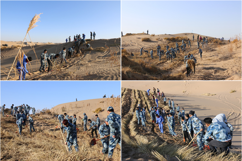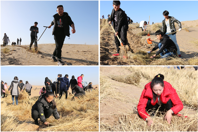 在勞動現(xiàn)場,學院領導和師生們不畏冬寒,分工協(xié)作,按照標準和要求劃線開溝、蒲草培沙、等距離推進,現(xiàn)場一片熱火朝天的景象。荒蕪的沙地身披新衣,整齊的稻草方格逐漸向遠處的沙丘覆蓋。